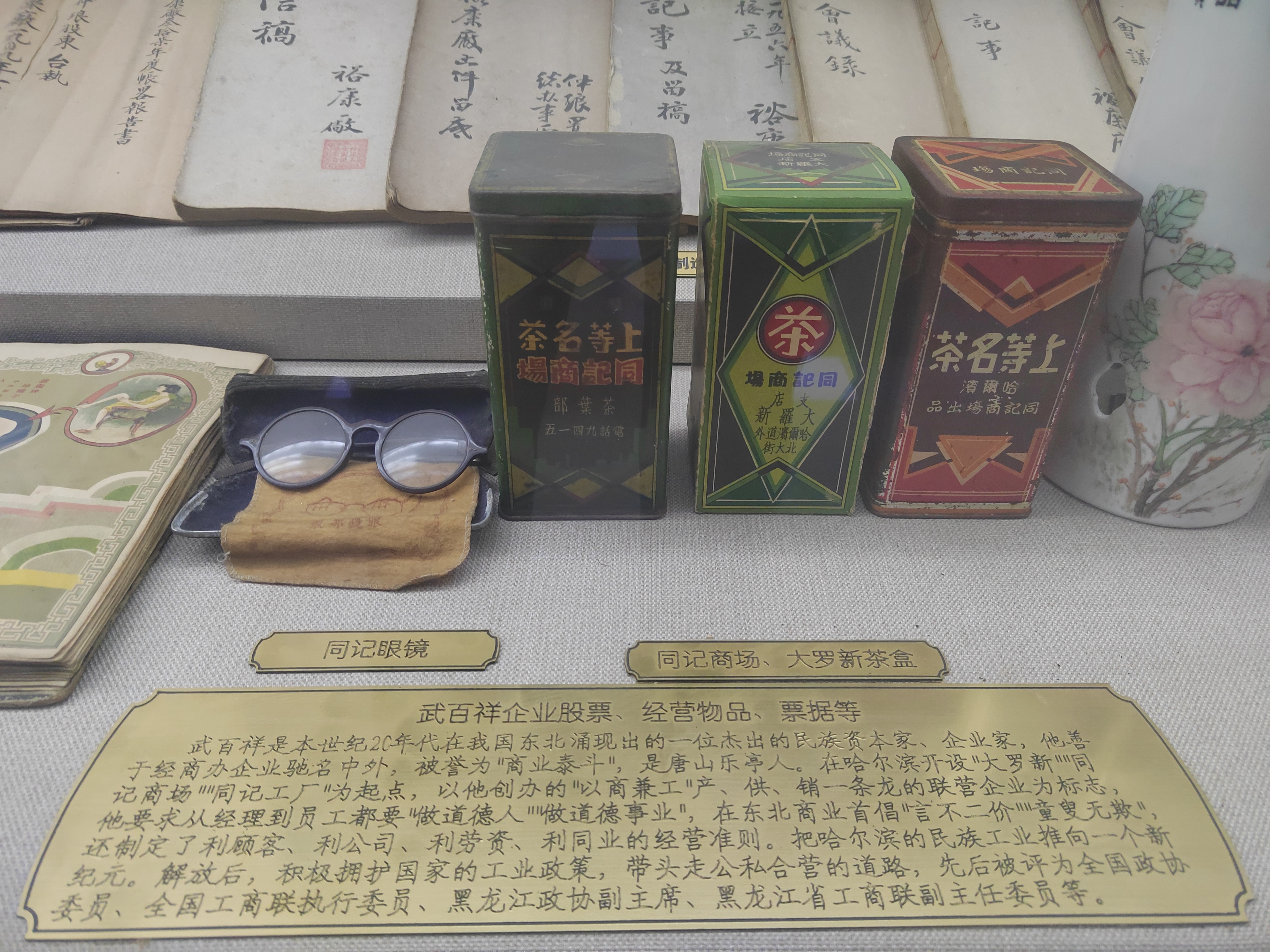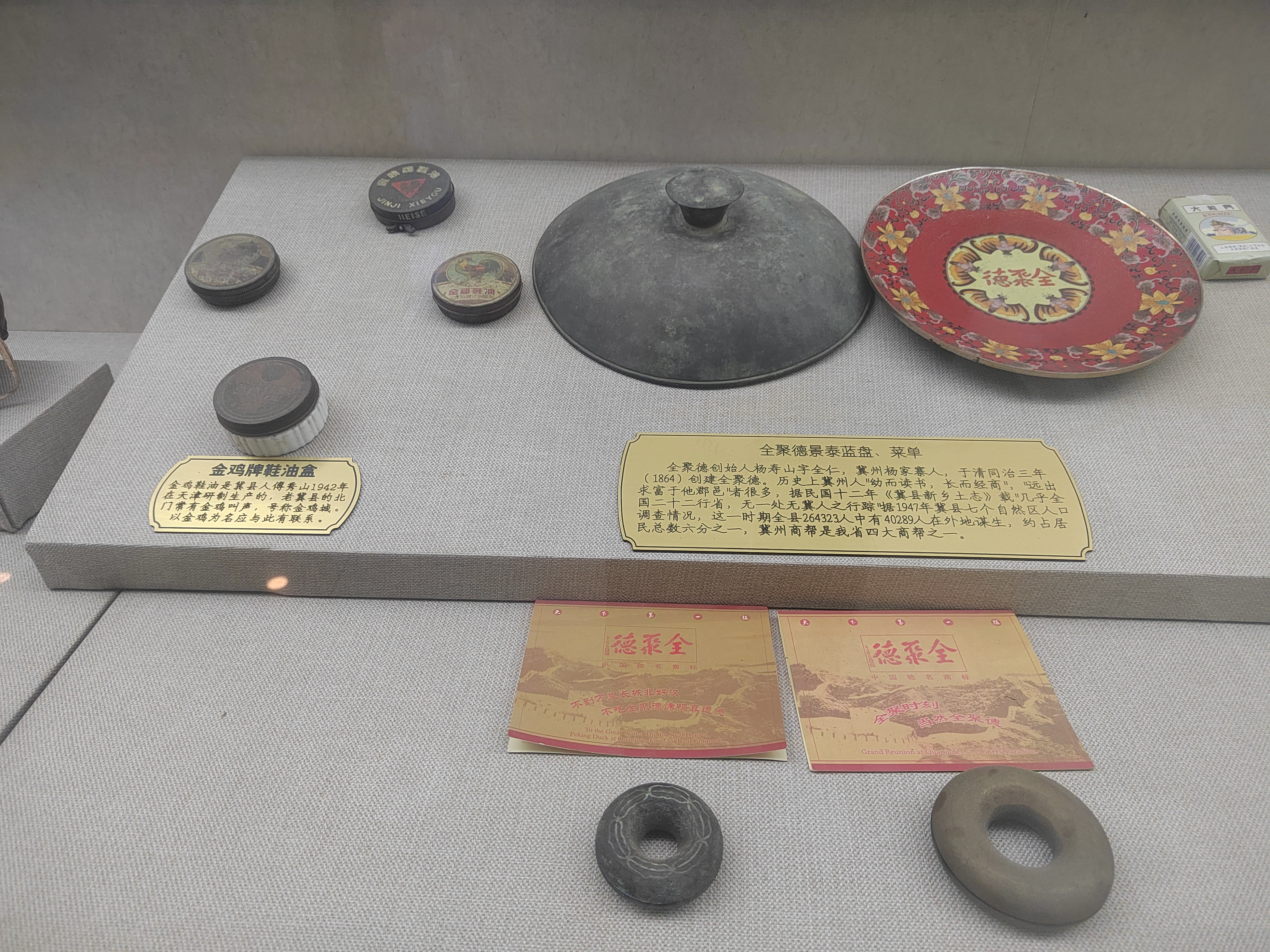 漫步冀商博物馆,走商货挑、锔盆锔碗工具箱、货郎鼓、泊头火柴厂股票……一件件珍贵文物向人们讲述着冀商故事。展厅一隅,一个印有“全聚德”的景泰蓝盘和一个刻有“全聚德”字样的锅盖吸引了记者的目光。“全聚德的创始人杨寿山是冀州杨家寨人,于清同治三年(1864年)创建全聚德。”贾广田告诉记者,这两个物件是20多年前他在北京古玩市场“淘宝”所得。“这4个金鸡牌鞋油盒,是2006年我去天津出差,在逛古玩市场时淘到的。”贾广田指着藏品介绍,金鸡鞋油是冀州人傅秀山1942年在天津研制生产的,听说老冀县的北门常有金鸡叫声,号称“金鸡城”,以“金鸡”为名也许与此有着密切的联系。