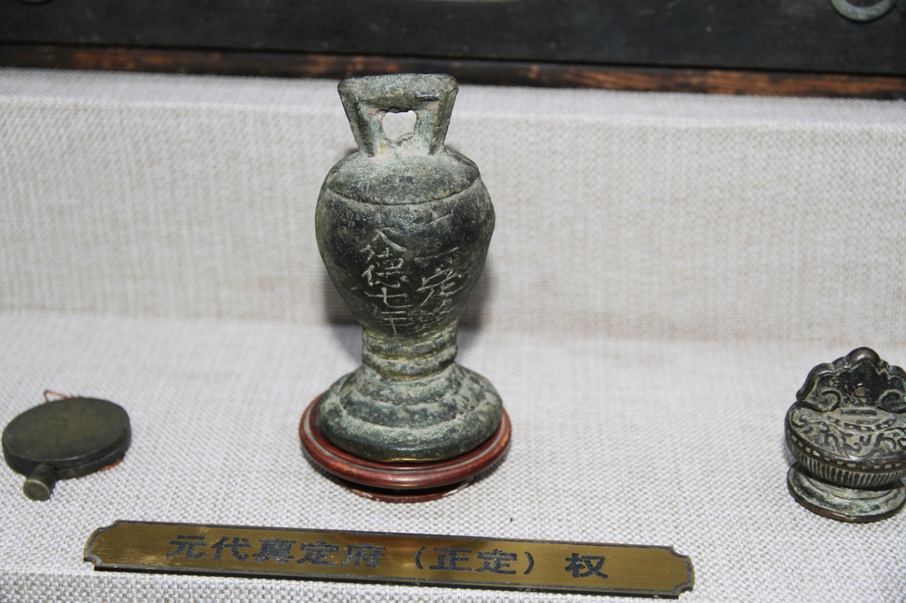 “走,先带你去看看我们馆的镇馆之宝。”当日上午9时许,跟随贾广田的脚步,记者来到位于博物馆北侧的橱窗前。“这枚高约13厘米,直径约6厘米的‘秤砣’是元代真定府权。”贾广田介绍,这枚权器型规整,锈色厚重,其底部是台阶式,腹部呈束腰型,上面写着“大德七年 真定路 中山府”,有着元代秤砣的显著特点。