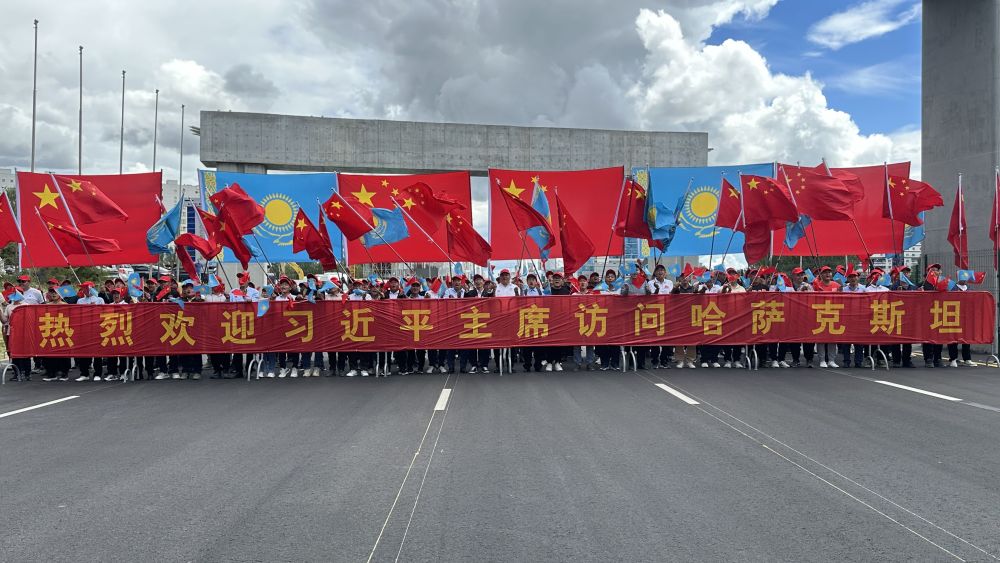 习近平乘车从机场赴下榻饭店途中,当地中资企业代表等候在道路两旁,挥舞中哈两国国旗,高举“热烈欢迎习近平主席访问哈萨克斯坦”等红色横幅,热烈欢迎习近平主席到访。