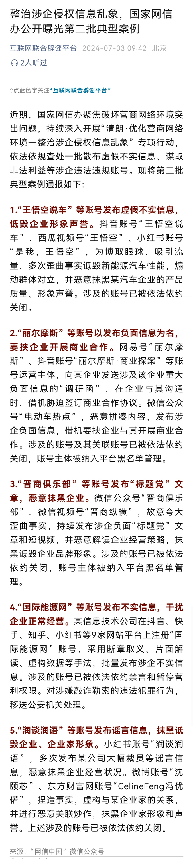 详情:近期,国家网信办聚焦破坏营商网络环境突出问题,持续深入开展“清朗·优化营商网络环境-整治涉企侵权信息乱象”专项行动,依法依规查处一批散布虚假不实信息、谋取非法利益等涉企违法违规账号。现将第二批典型案例通报如下:1.“王悟空说车”等账号发布虚假不实信息,诋毁企业形象声誉。2.“丽尔摩斯”等账号以发布负面信息为名,要挟企业开展商业合作。3.“晋商俱乐部”等账号发布“标题党”文章,恶意抹黑企业。4.“国际能源网”等账号发布不实信息,干扰企业正常经营。5.“润谈润语”等账号发布谣言信息,抹黑诋毁企业、企业家形象。(来源:网信中国)