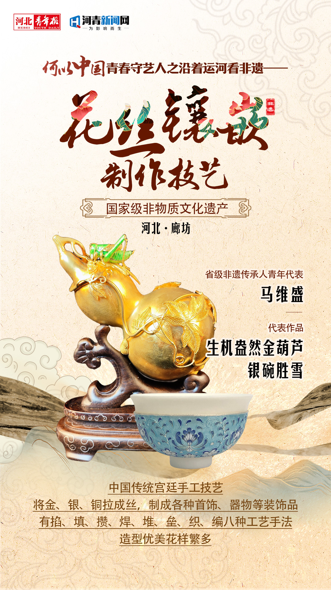 “花丝万缕织金冠,妙手镶嵌有乾坤。”正是一步步的坚持,从业10余年,马维盛先后被评为廊坊市非物质文化遗产项目代表性传承人、河北省非物质文化遗产项目代表性传承人。