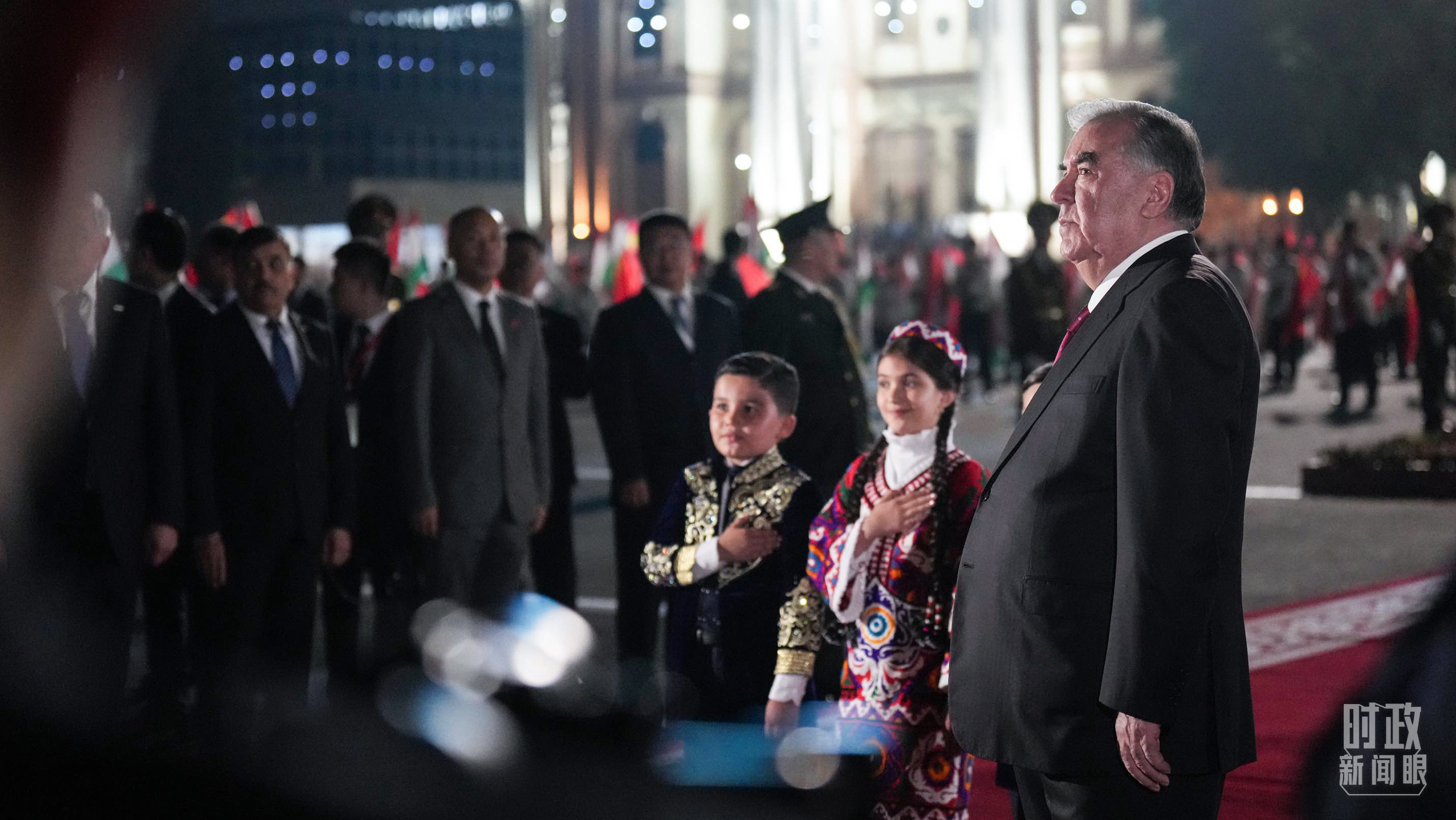 拉赫蒙总统拉起习主席的手,登上观礼台,共同感受这份似火的热情。