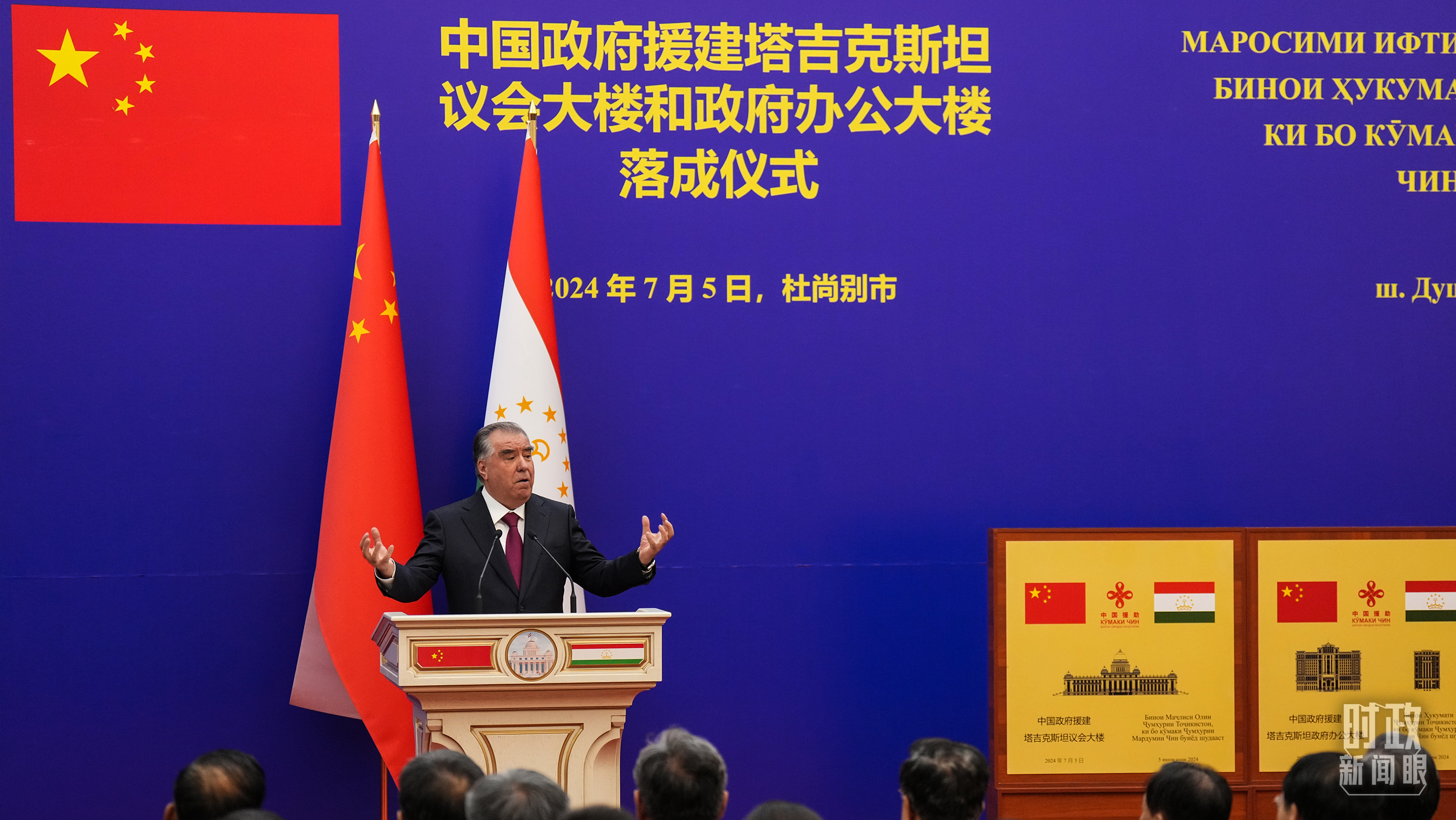 5日,拉赫蒙总统陪同习主席共同步入议会大楼。两国元首参观中方援塔议会大楼和政府大楼项目展板,共同为两座大楼揭牌。