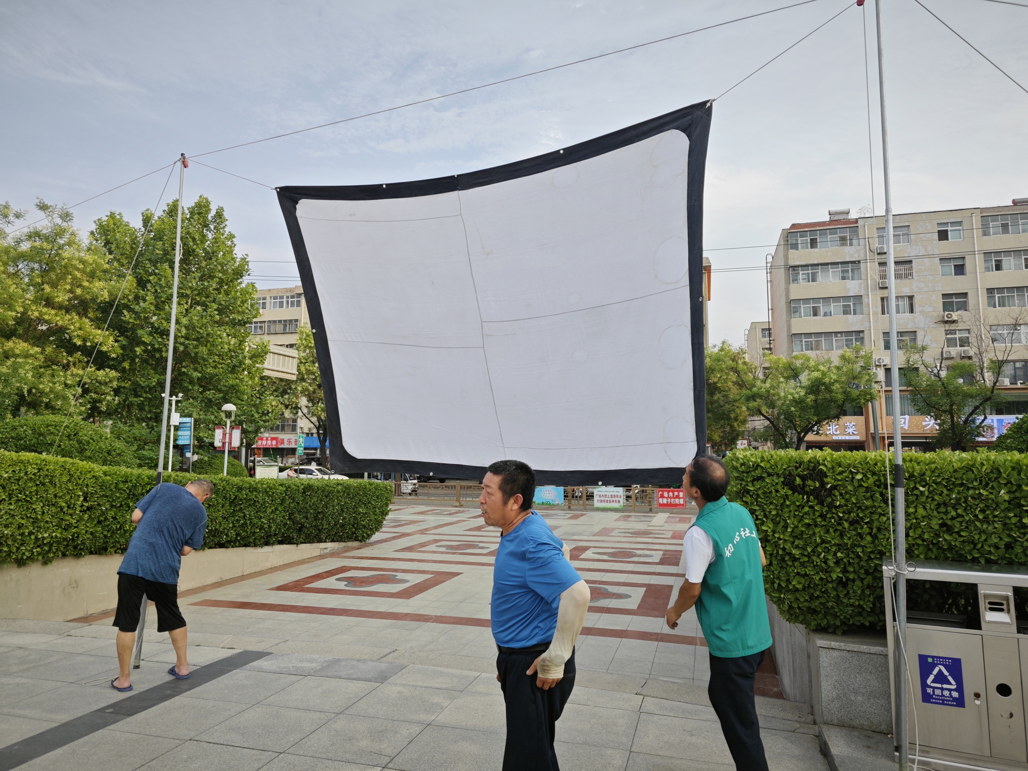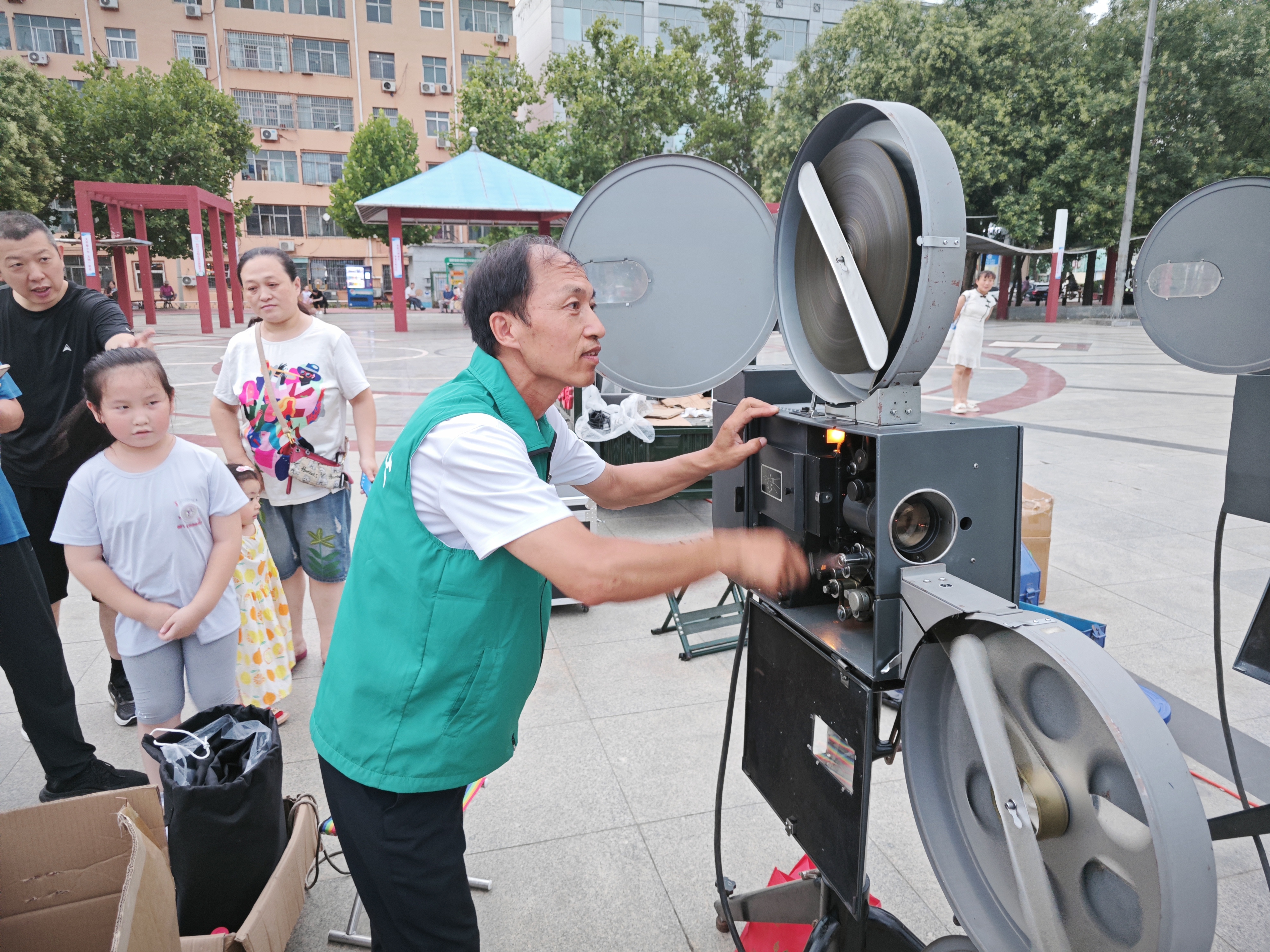 银幕挂起,夜幕降临。只见衡水市体育休闲广场的“民情驿站”前十分热闹,大人小孩都搬来小板凳,街坊邻里围坐在一起,吹着晚风,唠着家常,等待着电影播放。义务电影放映员刘显富正在调试设备,将要为居民放映影片《七七事变》,给广大居民带来一场红色电影文化盛宴。