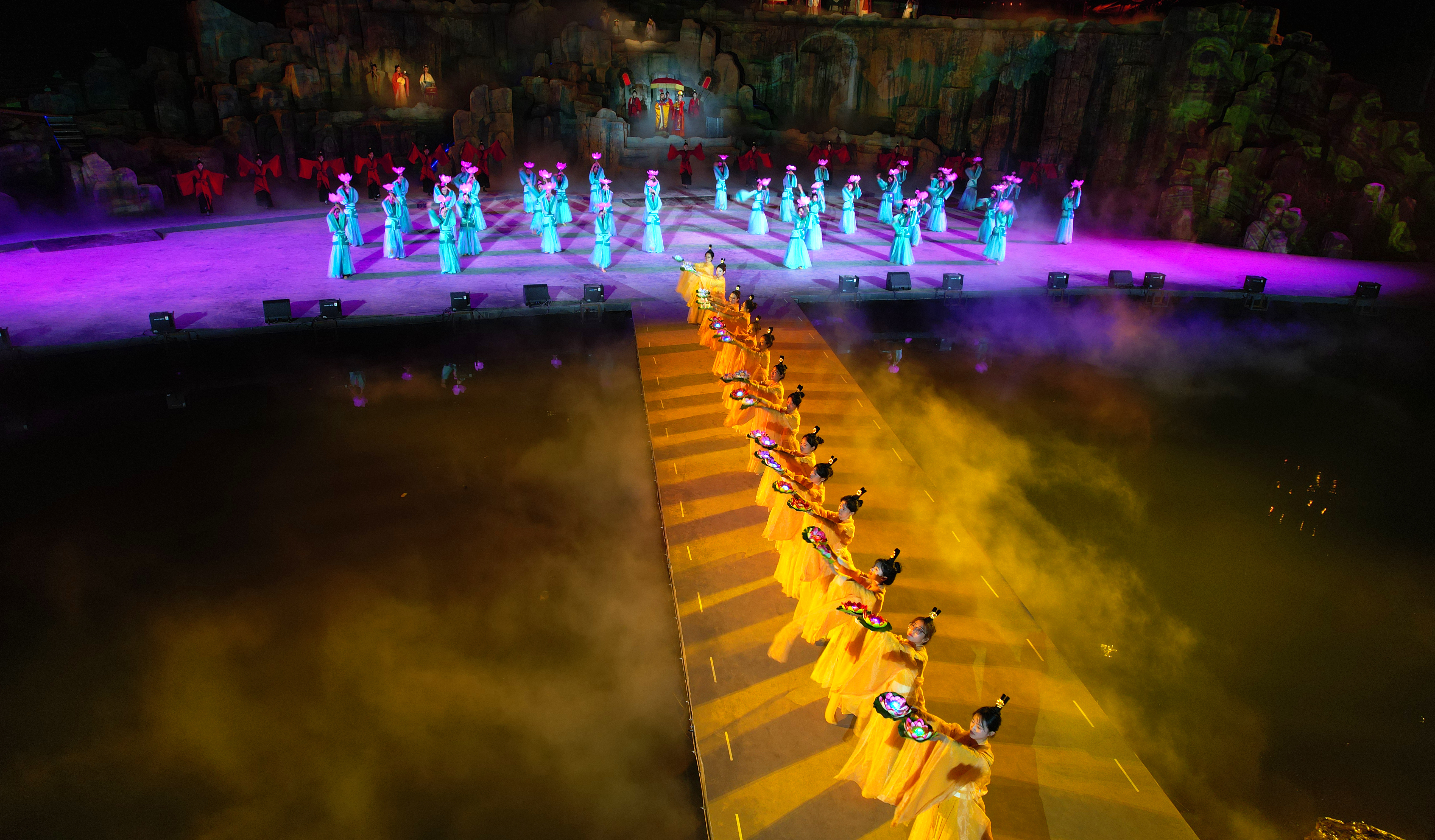 “看”山海变化,“听”书声琅琅,“闻”美酒飘香,“触”历史人物。《大美衡水 湖韵千年》主舞台实景演出以水为脉,以四季轮转代指千年赓续,山水楼桥多位一体,音舞诗画巧妙融合,加之Mapping秀、雾森、喷火机、飞行器等特效技术的运用,打造集声光电、视效音效于一体的大型光影实景演出,给观众们呈现出一幕幕绚丽震撼的视觉盛宴。