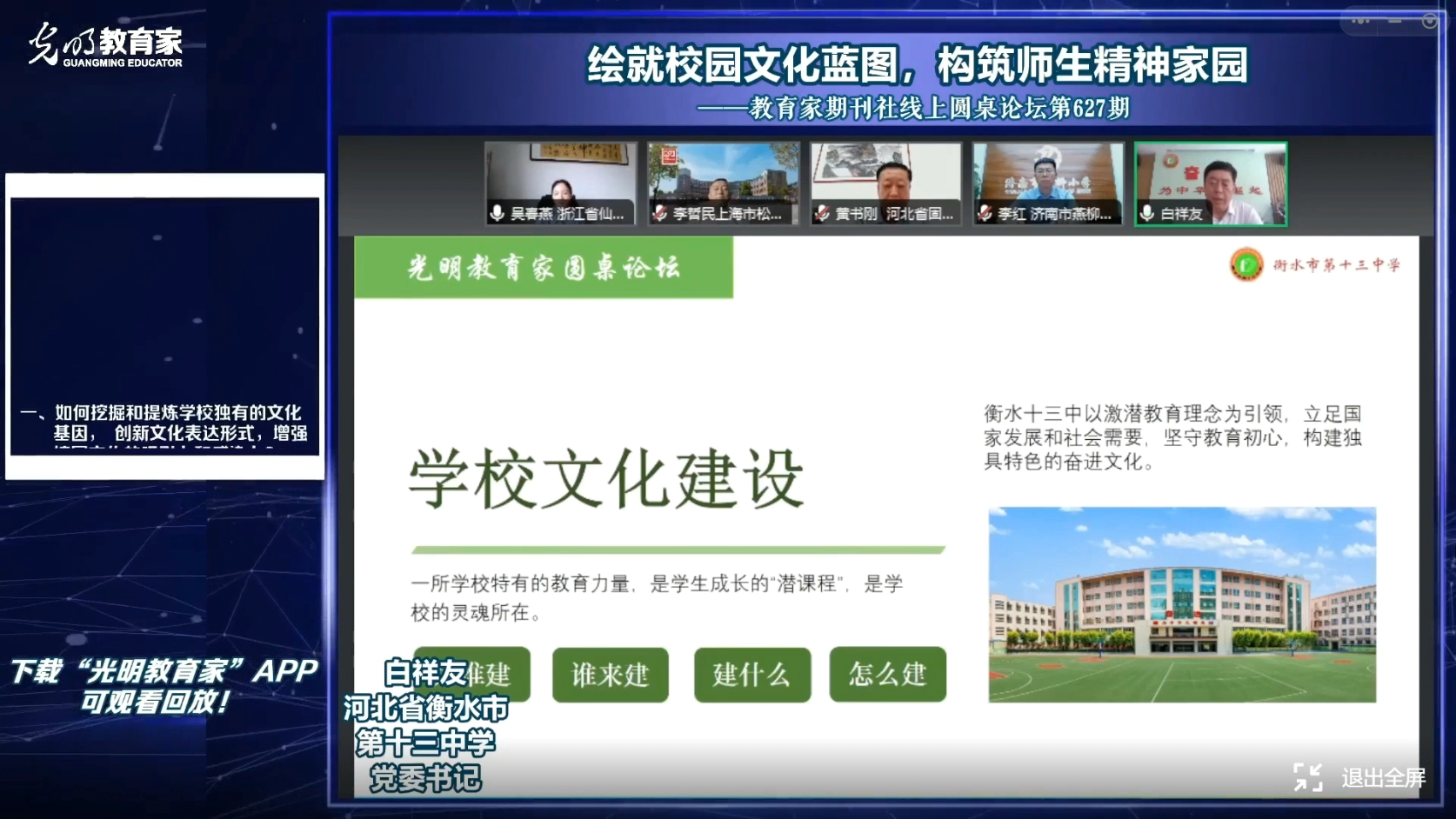 绘就校园文化蓝图,构筑师生精神家园。近日,白祥友校长工作室主持人、衡水市教育局督学、衡水市第十三中学党委书记白祥友受邀参加光明教育家杂志线上圆桌论坛,并作主题为《深耕奋进文化 赋能内涵发展》的专题报告,白祥友校长工作室全体成员线上参加了此次活动。