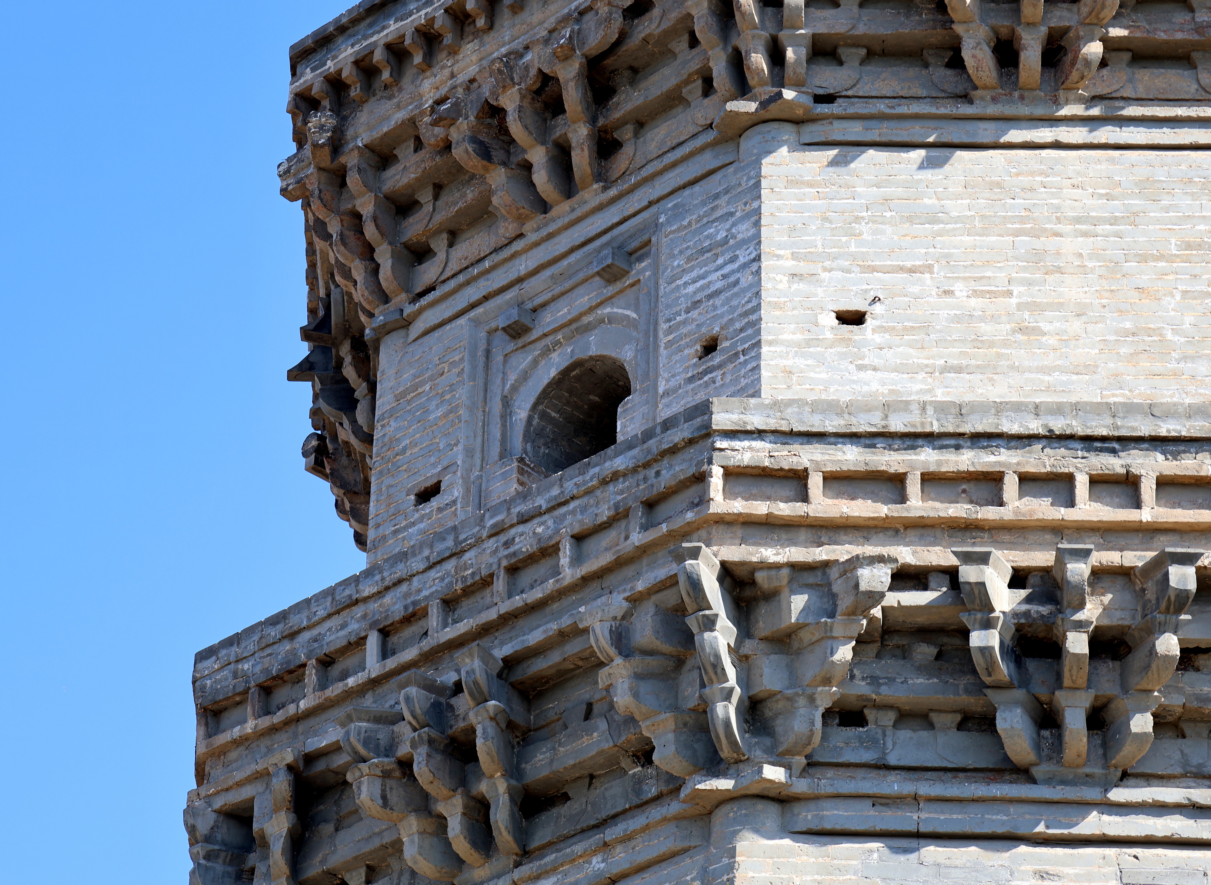 在桃城区文物所所长翟晓娜的引领下,记者进入宝云寺,沿着两侧种有冬青和松柏的青砖小路,来到寺内东侧,宝云塔全貌尽收眼底。这座原名擎天塔的楼阁式砖塔,呈八面棱锥体,共9层,高32.64米,塔基周长28.8米。因古塔在宝云寺院内,后来也沿用了寺的名字叫宝云塔。关于其始建年代,《衡水县志》有隋朝大业二年和唐代建造两种记载,但均无碑志可证。1980年,中国科学院自然科学史研究所的张驭寰教授对宝云塔进行了实地考察,鉴定为北宋初期所建。