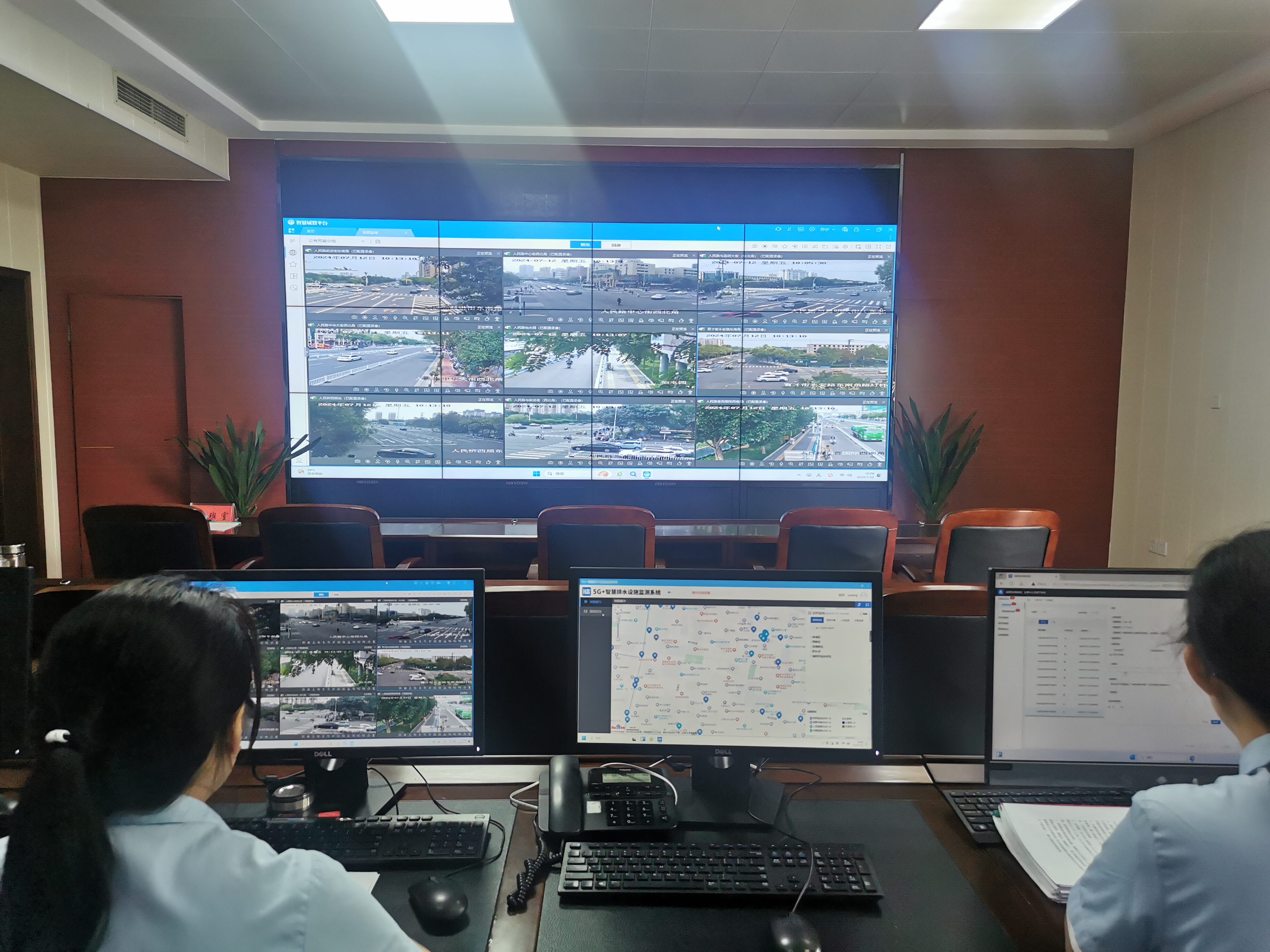 7月11日,在衡水市智慧排水指挥大厅里,工作人员正通过市区智慧排水管理平台关注主城区降水排沥动态情况。只见他们轻点鼠标,辖区主要路口、重要区域、积水隐患点等实时画面便呈现在指挥大屏上。