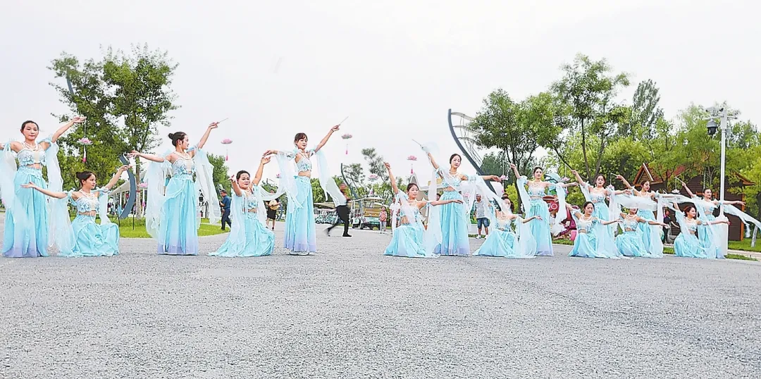 在“仙子”们的指引下,游客顺着游览路线一路向前。不远处,十几位身着青色纱衣的汉服“仙子”衣袂飘飘,仿佛从画中走出。在悠扬的音乐声中,她们手持莲花翩翩起舞,用舞姿演绎衡水湖的钟灵秀美,表达对美好生活的憧憬和向往,一颦一笑牵动人心,曼妙的古风舞蹈,为观众展现了一场如梦似幻的视觉盛宴。