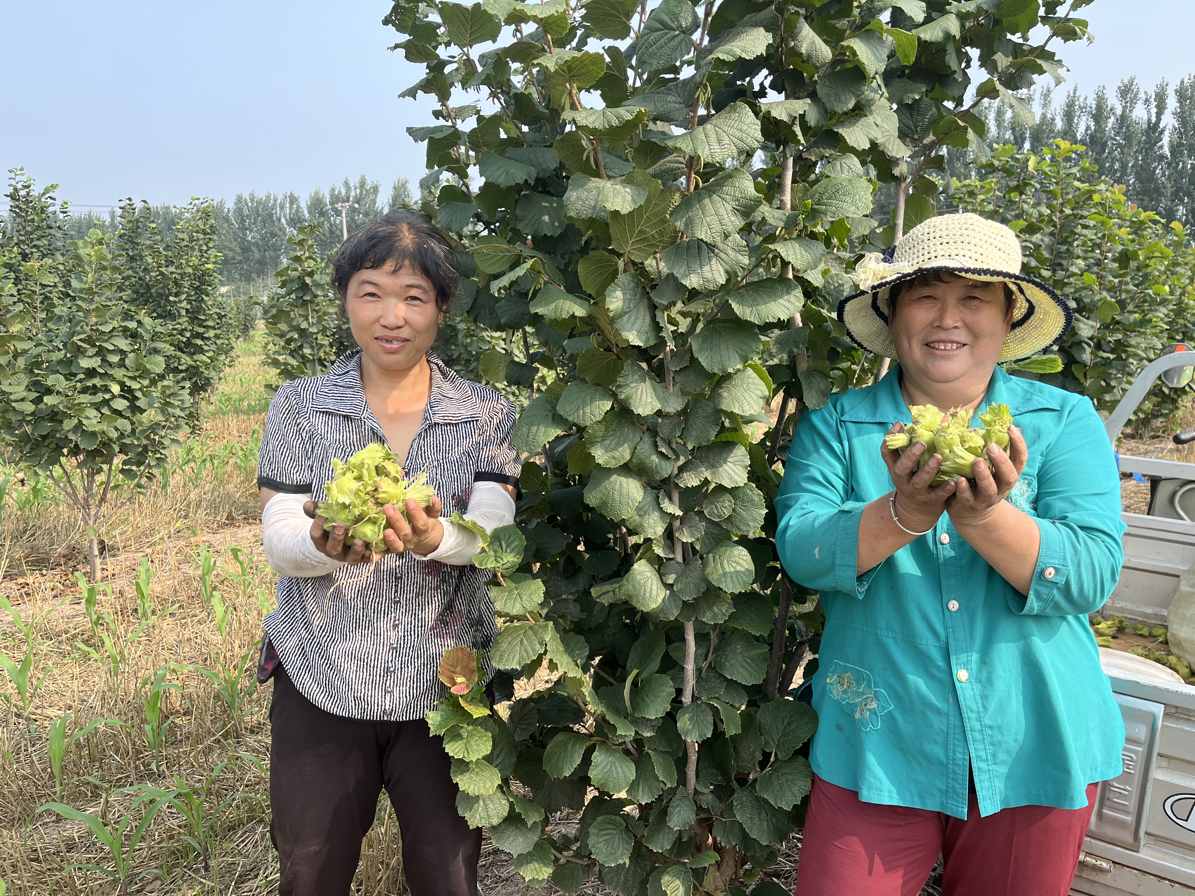 置身采摘园中,满眼皆绿,一片生机勃勃,只见50多个村民正在采摘榛子,不一会功夫就摘满一桶,随手倒进三轮车的麻袋里。“今早上5点多就来了,趁着凉快多摘些。”附近后屯村的村民王增华老两口手脚麻利地摘着。