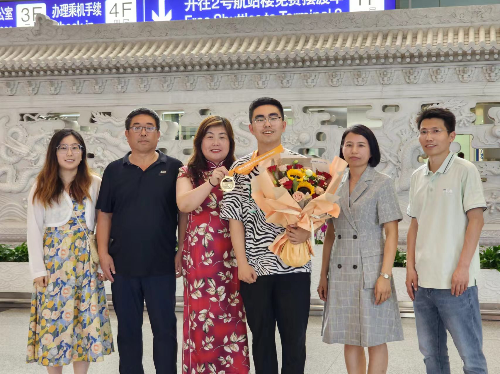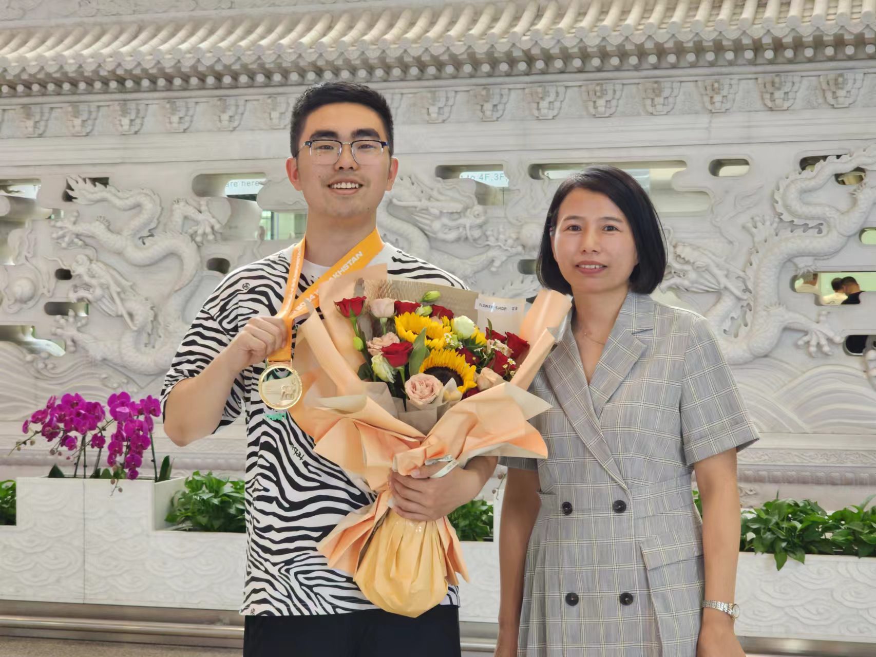 7月14日,在北京首都机场,戴着金牌、穿着条纹T恤的王培昱一出现,立刻成为了全场的焦点,鲜花、掌声一齐涌向了他。“培昱,好样的!一举拿下世界第一,不仅给祖国争了光,也为咱衡水教育添了彩。”王培昱的生物教练邢野亲自为他送上鲜花,表示祝贺。王培昱双手接过,谦逊地说,“感谢老师的辛勤培育,为国争光,我做到了!”说话间,灿烂的笑容在他的脸上绽开,散发出青春少年独有的自信光芒。