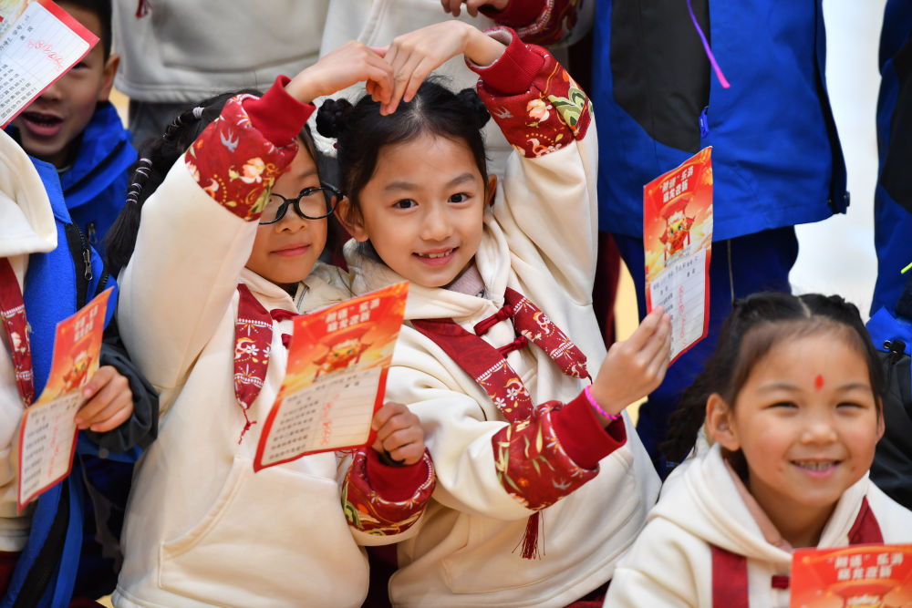 在湖南省长沙市天心区的湖南师大附中双语实验学校,一年级学生在趣味闯关活动中展示自己的闯关卡片(2024年1月18日摄)。新华社记者 陈泽国 摄