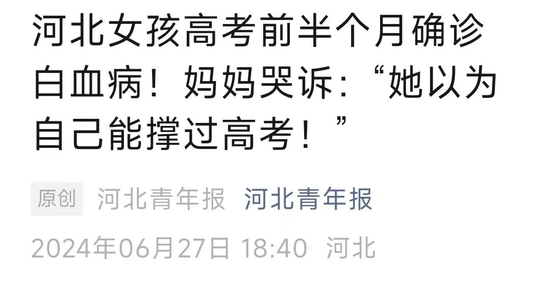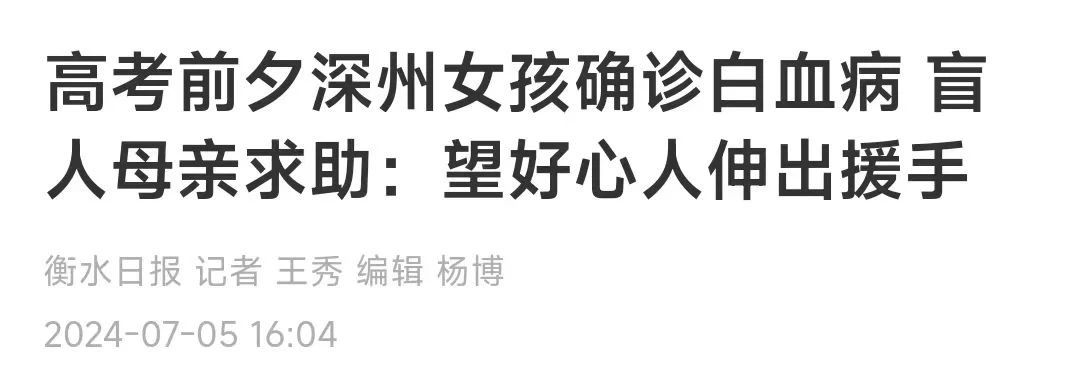 深州18岁女孩张奥盈,在高考前半个月查出身患急性白血病。她的妈妈是盲人,爸爸患有精神疾病,高额的医疗费让女孩和她的父母一筹莫展。
