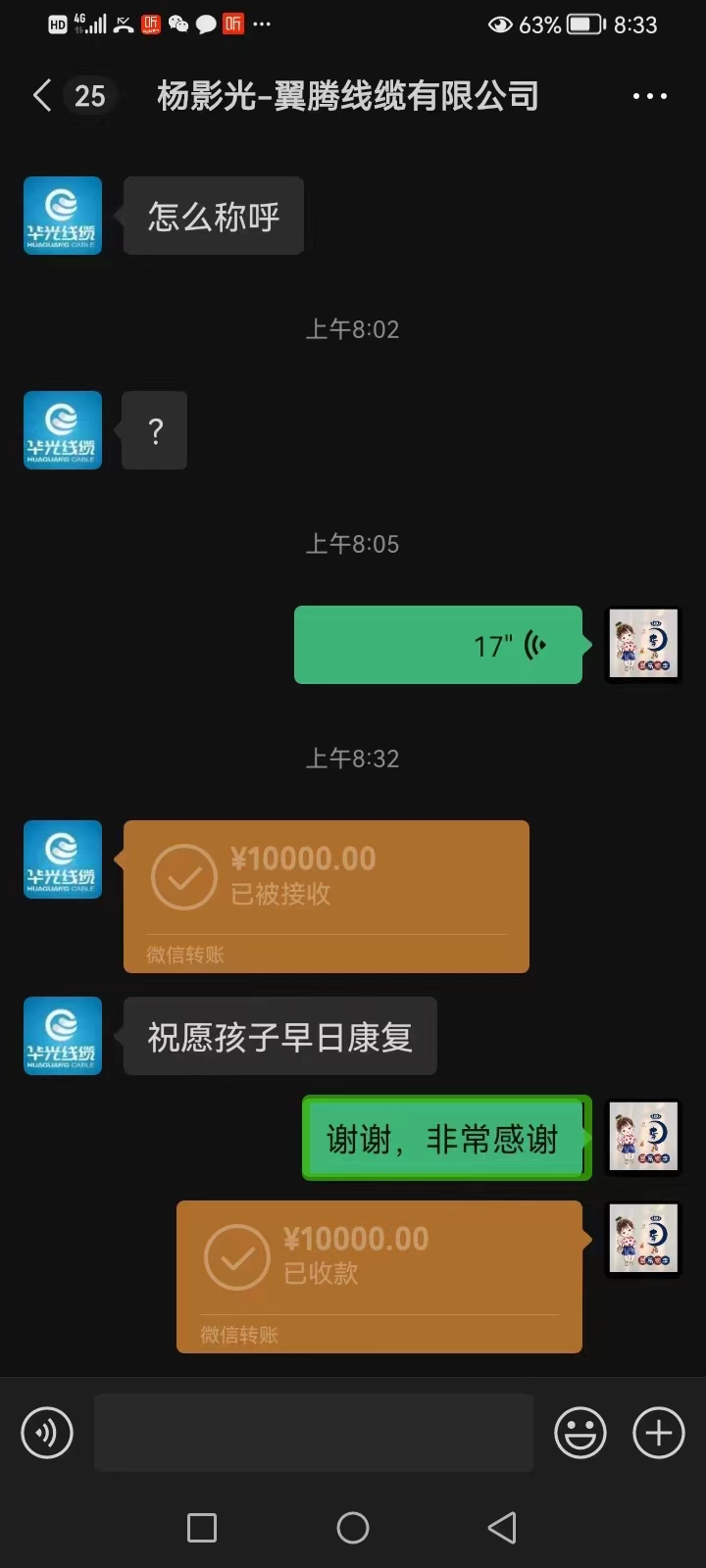 李晚融把大家的捐款都截了图,有几十元、几百元的红包,也有成千上万的转账,捐款的有全职宝妈,有单位职工,有个体商户,还有企业。沧州翼腾线缆有限公司直接为李晚融转账一万元;热心网友“佳慧”,对张奥盈的遭遇十分同情,个人转账5000元……