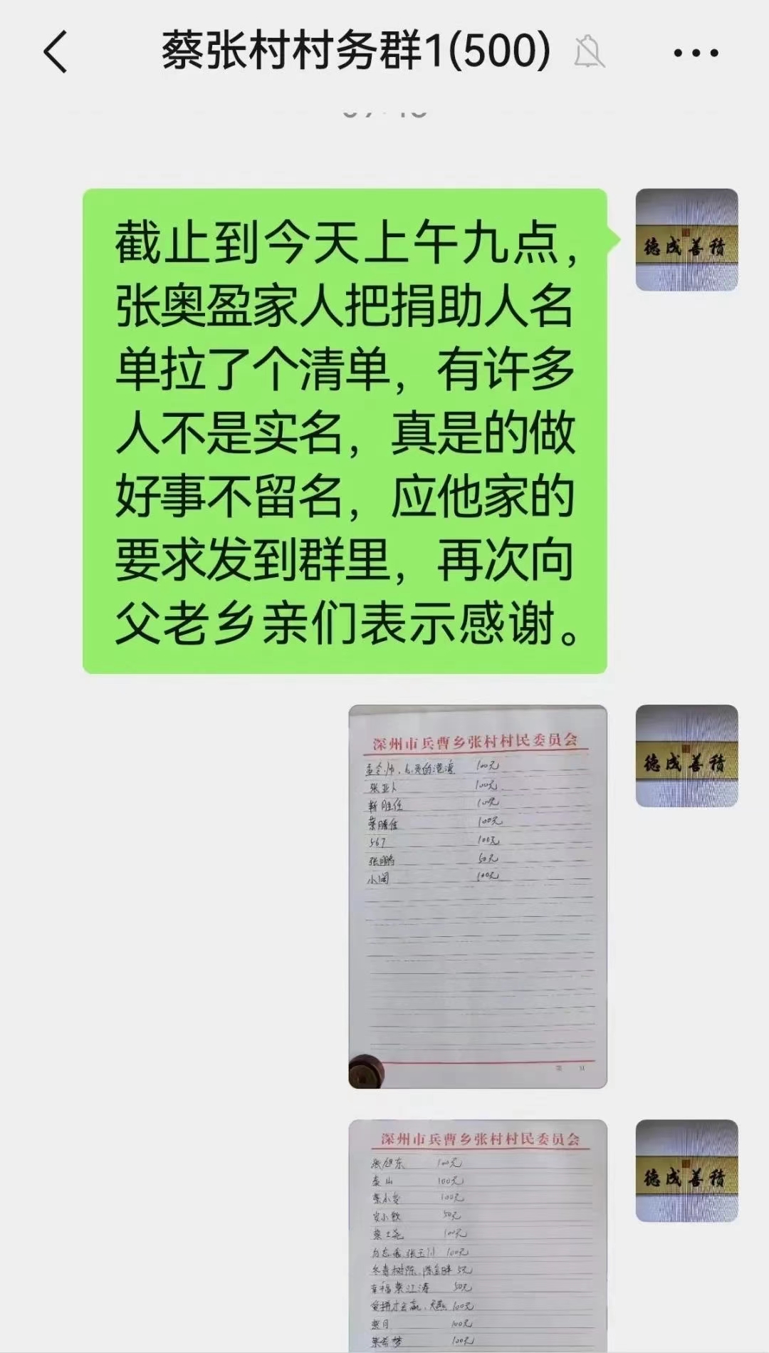 与此同时,张奥盈的家乡深州市蔡张村的乡亲们也主动捐款,很快汇集善款14985元。