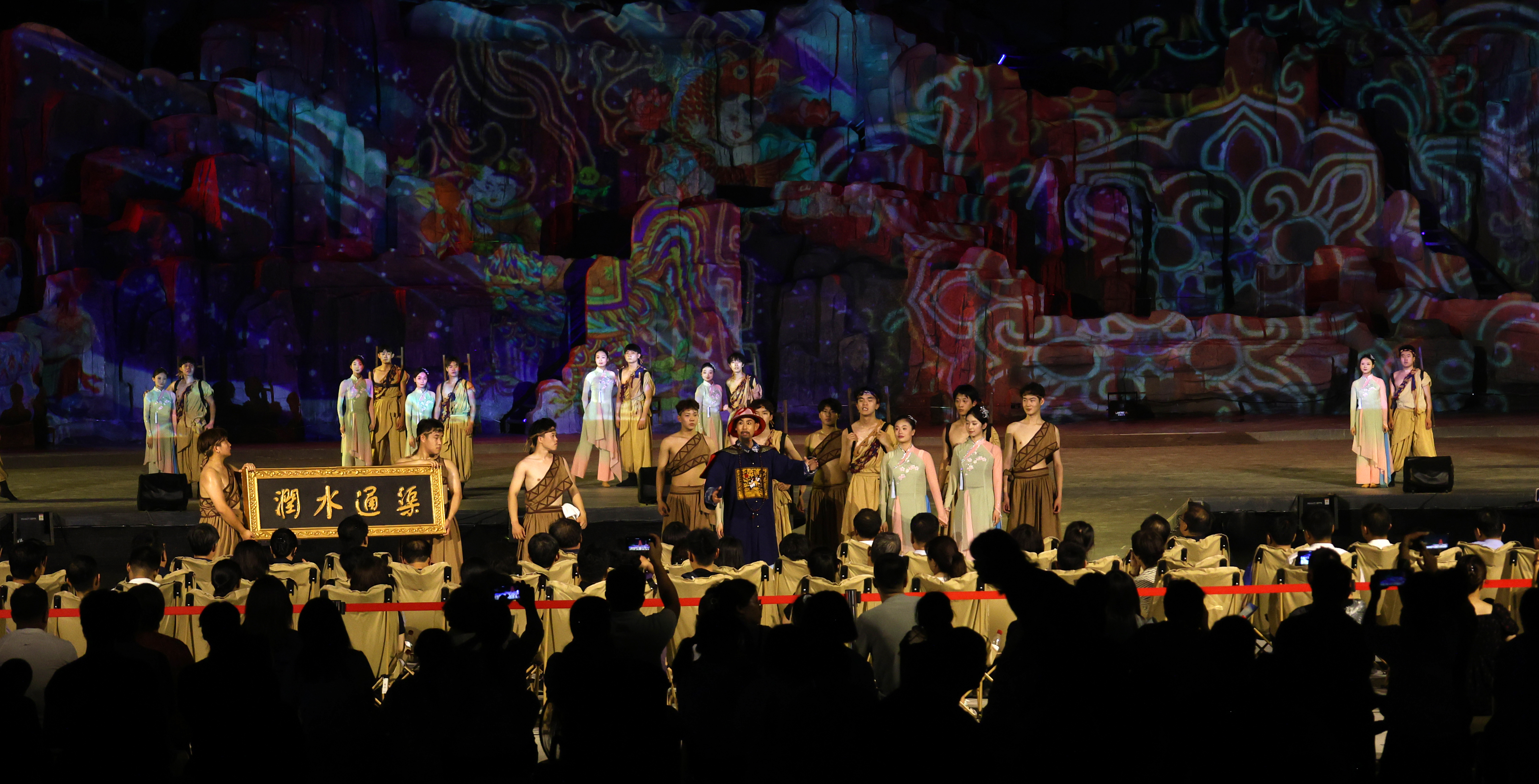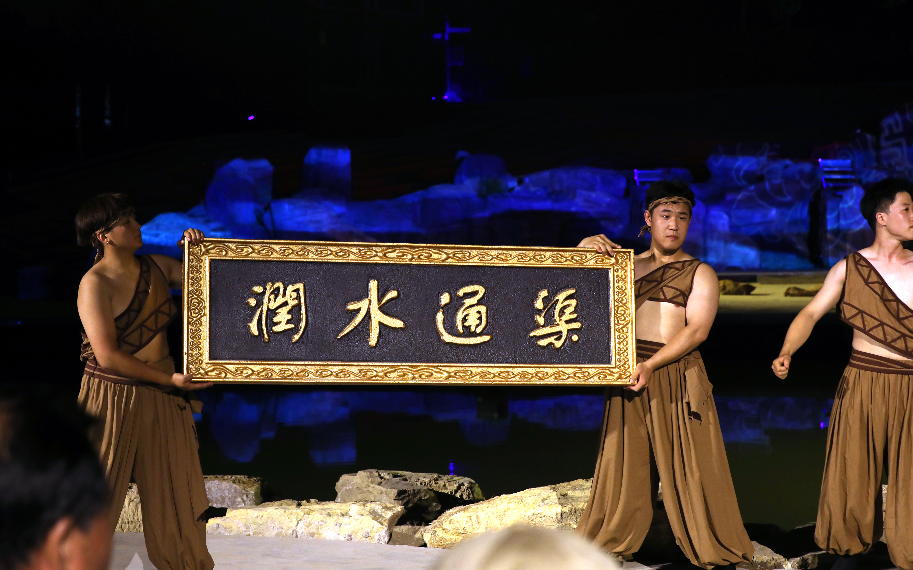 “修渠建闸水利昌,湖清河晏赞贤良。吴公治水民安乐,朝露春雨润一方……”演出第二篇章《福泽·水润一方》第二小节伊始,舞台上水雾四起,智者在烟雾高台处的念白,瞬间吸引了观众的注意力。光影闪烁中,伴随着铿锵有力的打夯号子,一群男子在吴汝纶的带领下修渠建闸、防洪排涝,竣工后百姓歌舞庆祝,还为吴汝纶送上“渠通水润”的牌匾,历史上一幕幕高光时刻再现于眼前,恢宏又震撼。