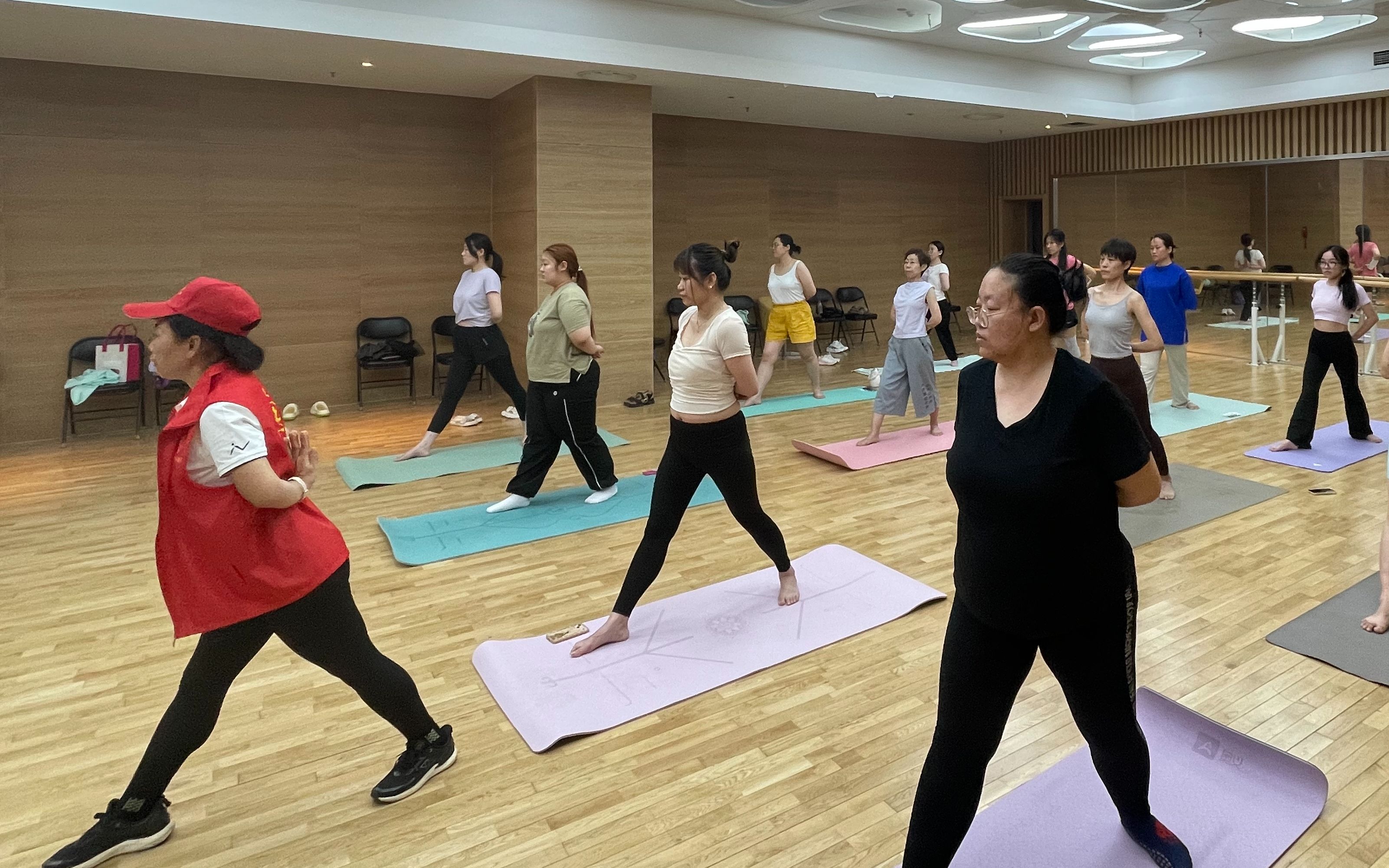 市群艺馆“青年文化夜校”瑜伽班学员跟随指导老师练瑜伽。