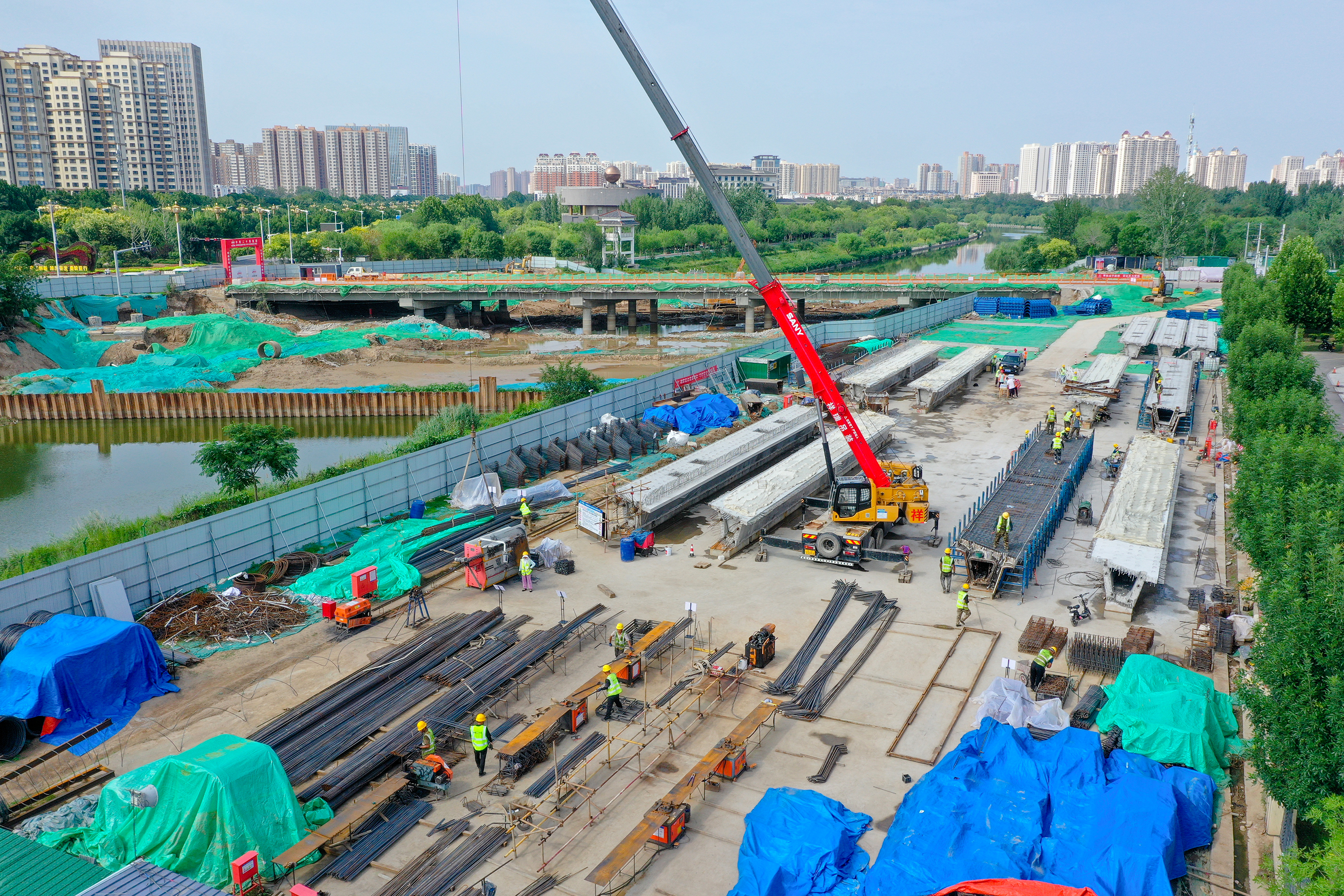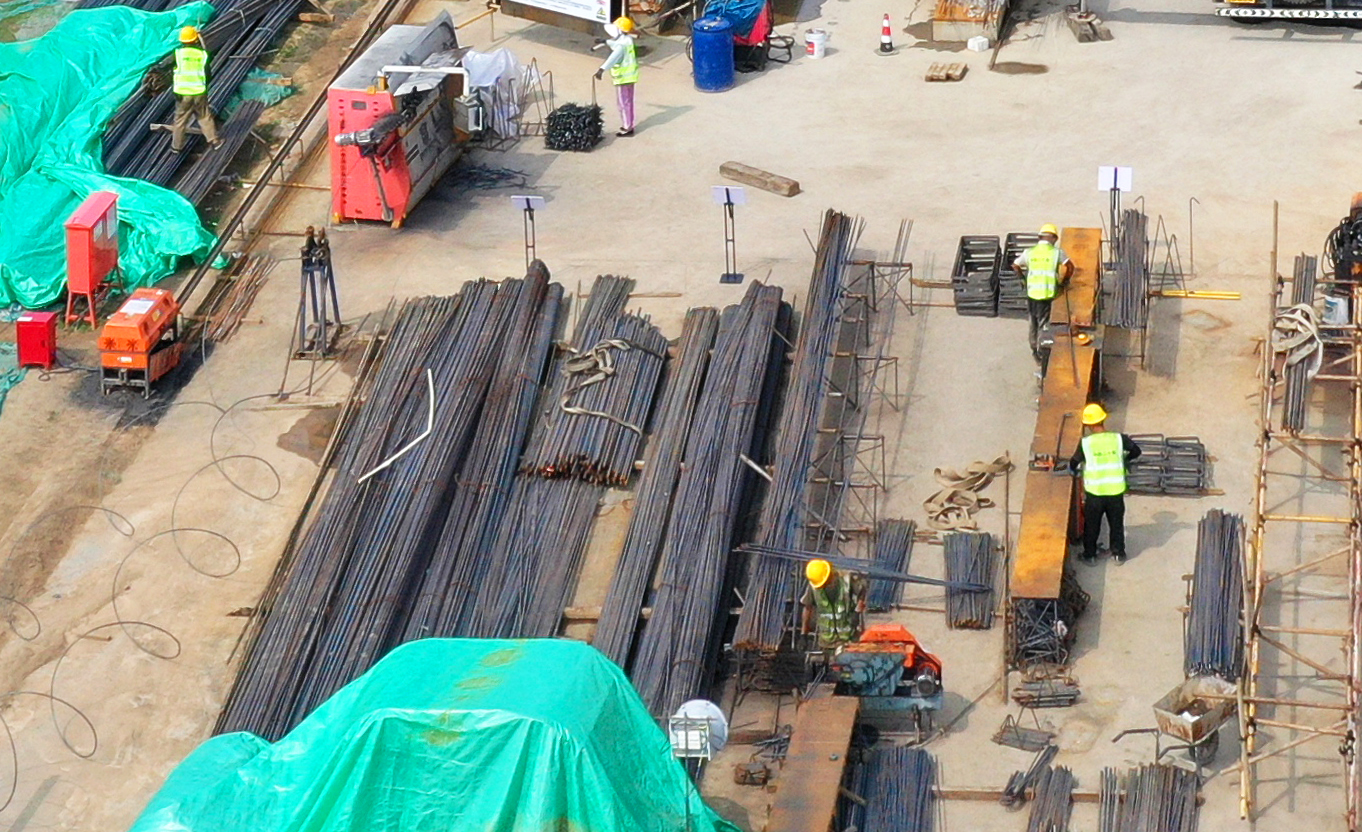 滏阳路(前进街至育才街)道路改造提升工程项目建设现场施工人员正在切割钢筋。