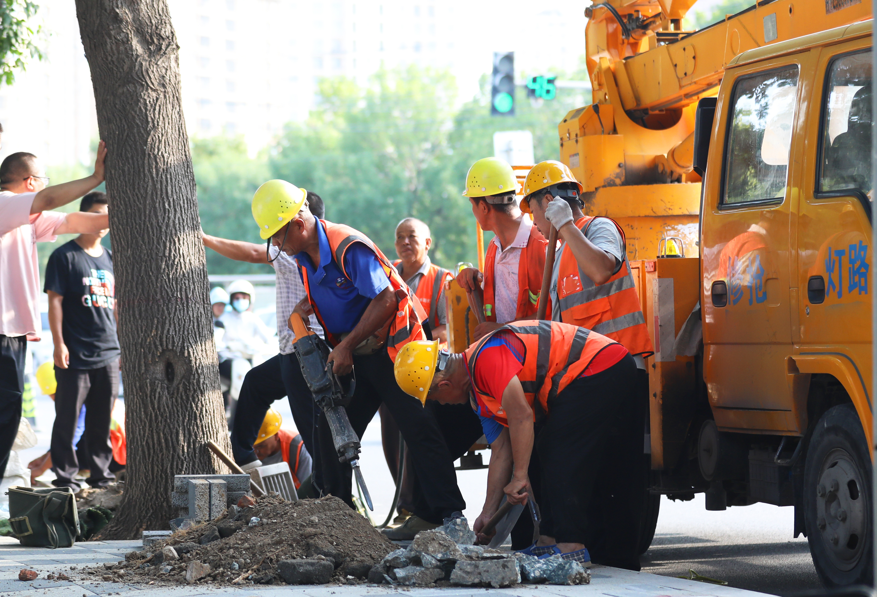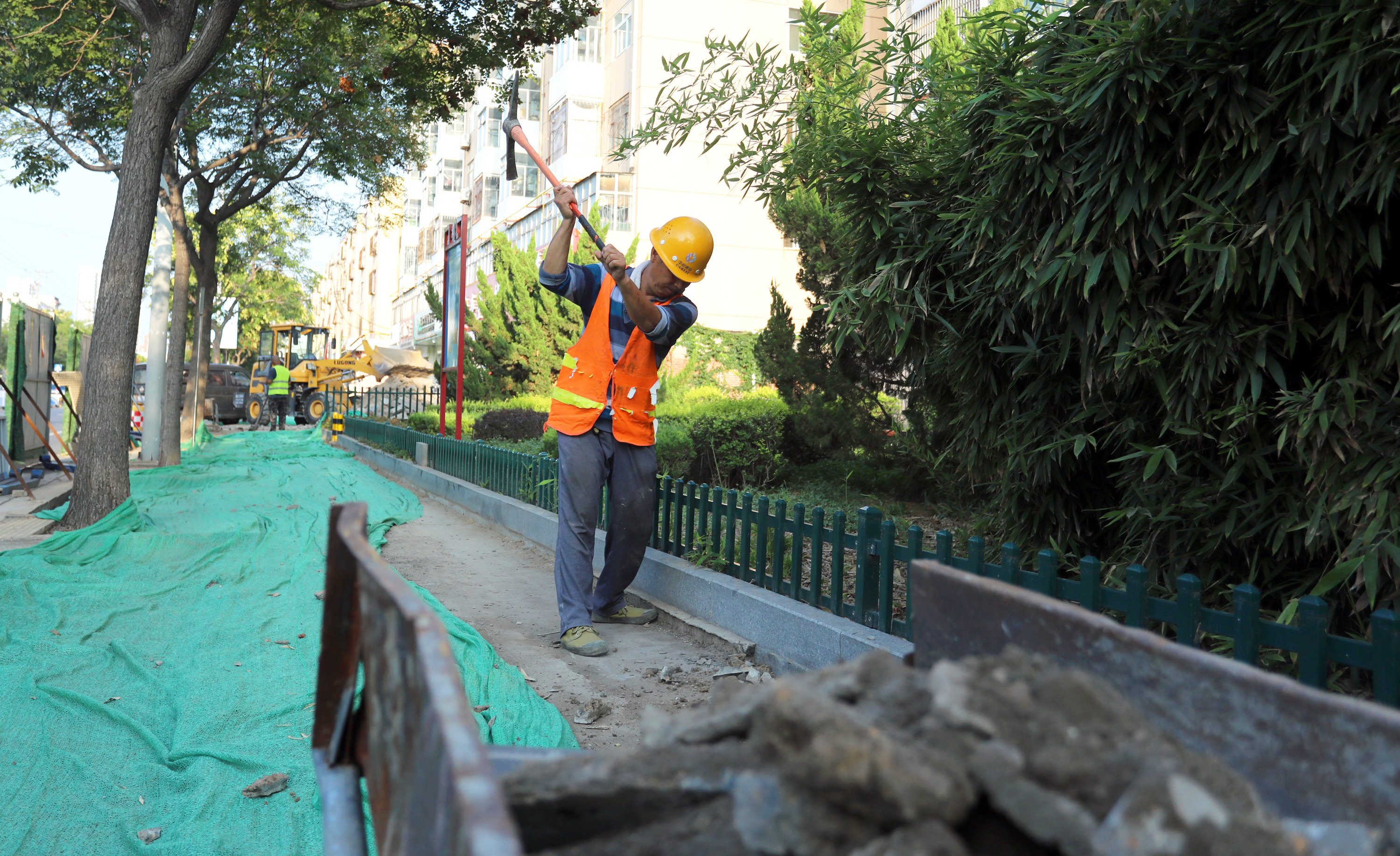 永兴东路人行道提升改造施工现场,施工人员抡镐剔边作业。
