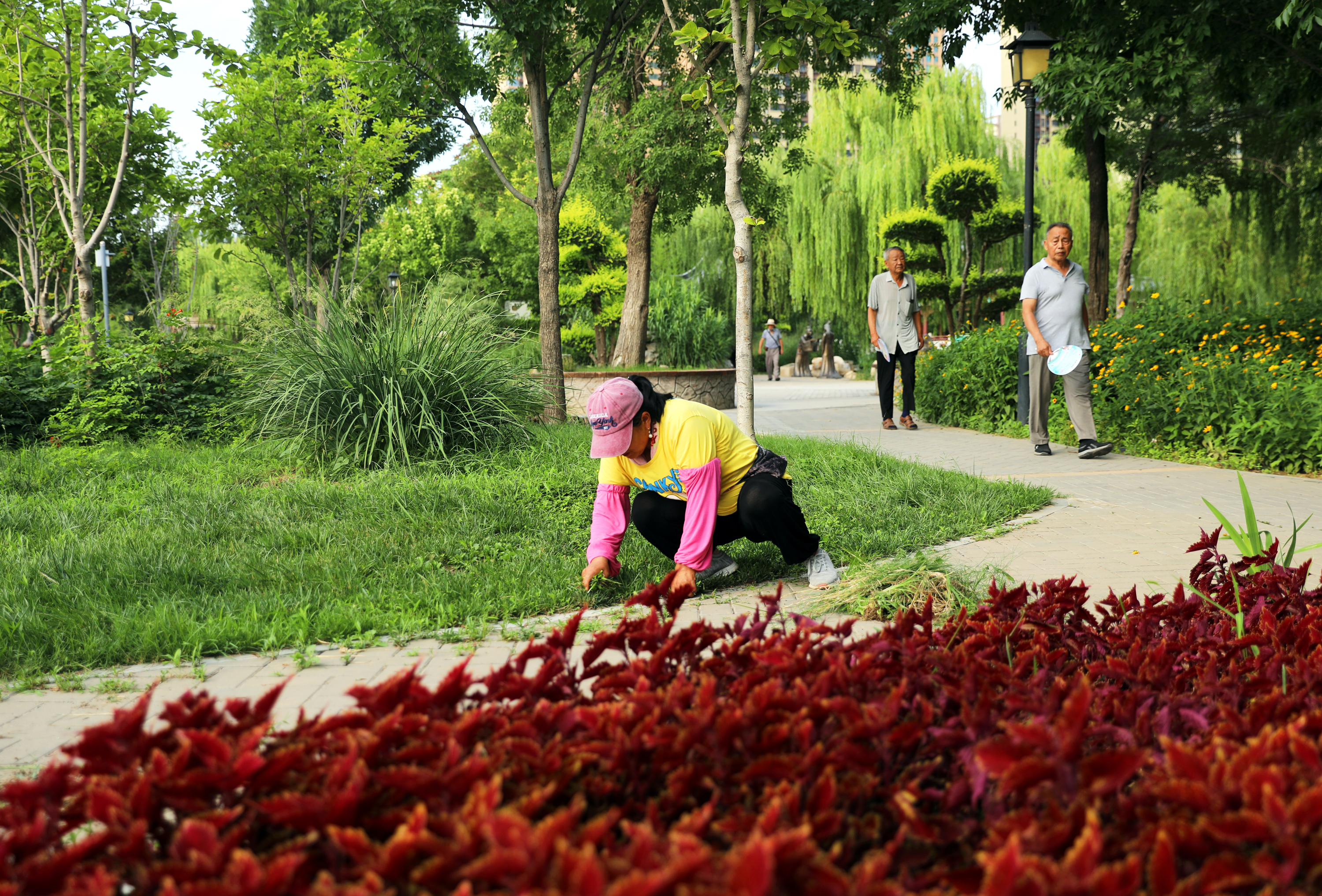 人民公园内工作人员正在清理步道上的杂草,为市民提供舒适的休闲环境。