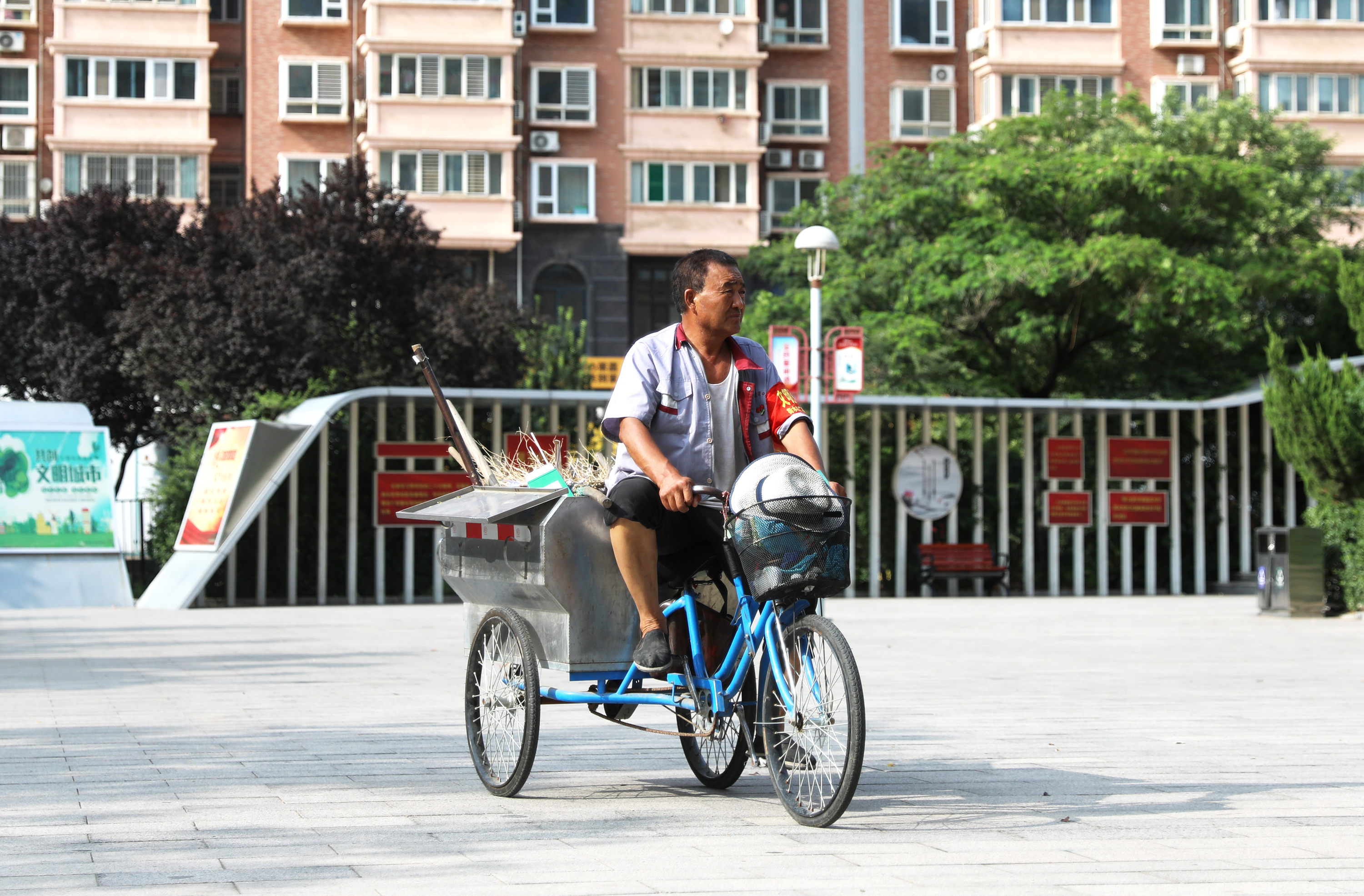 休闲广场环境维护工作者正将清扫、收集的垃圾运往垃圾站中转站。