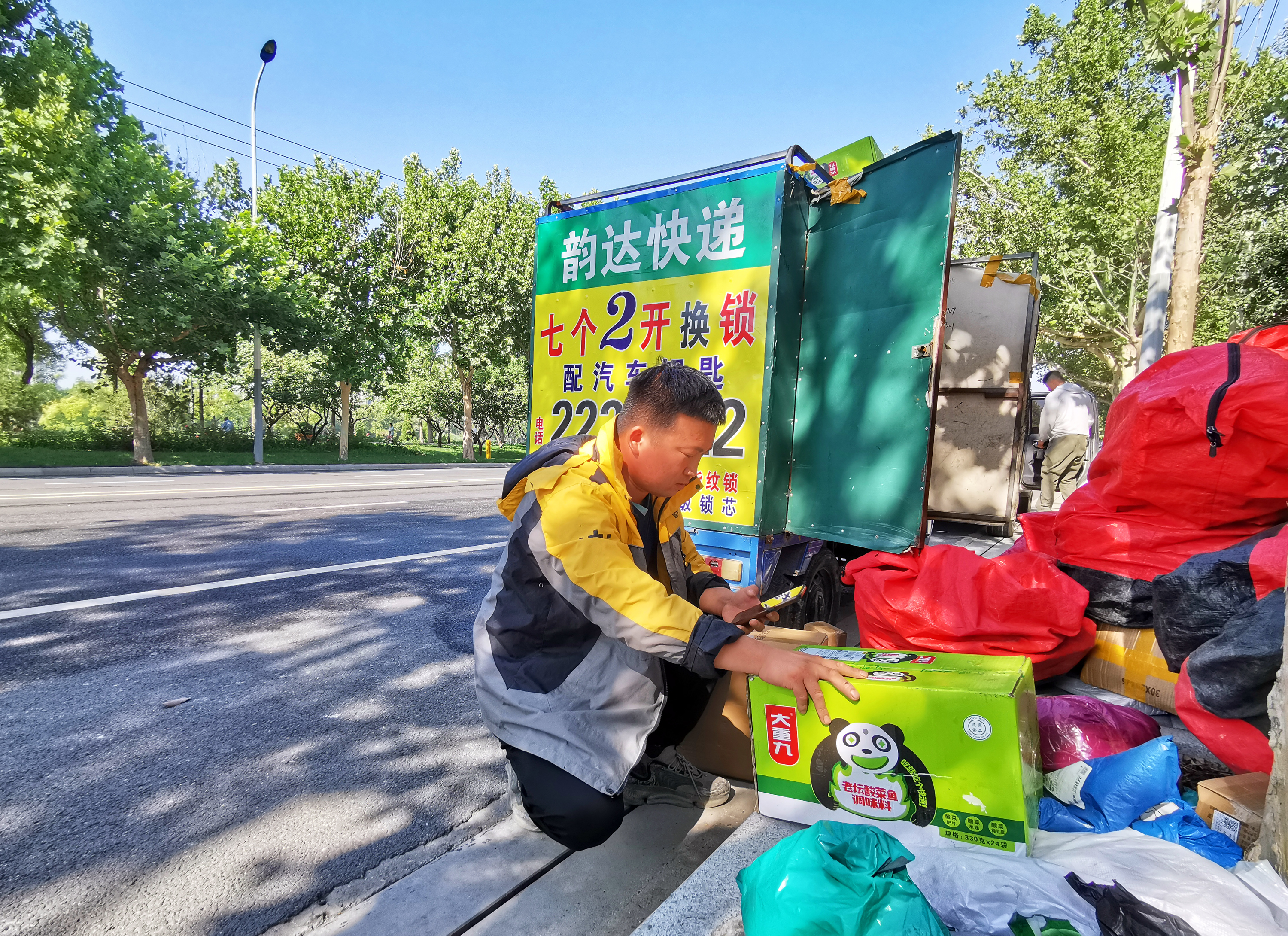 快递员正在分拣包裹,及时投递到客户手中。