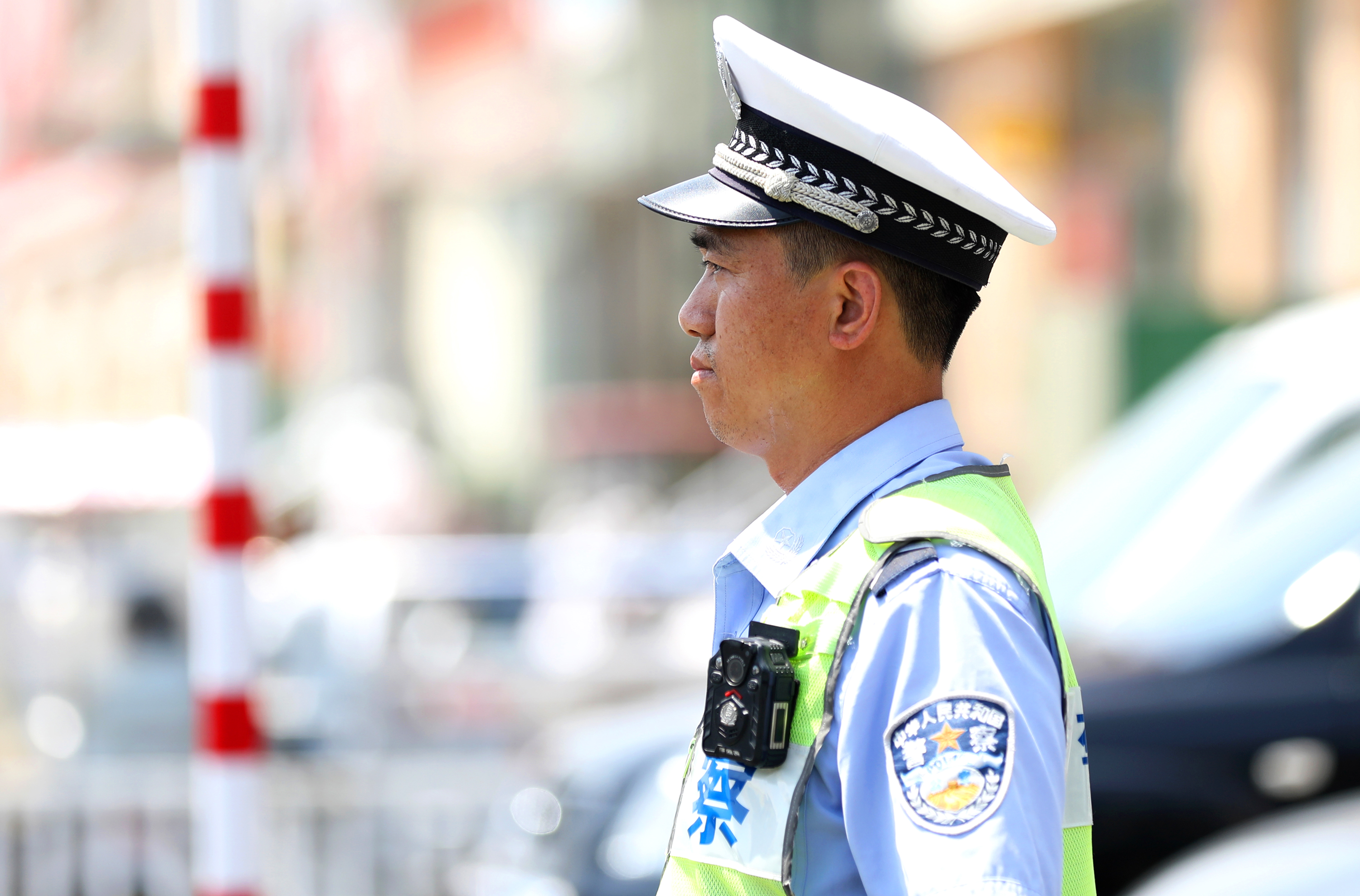 胜利路交通岗交警冒着酷暑执勤。
