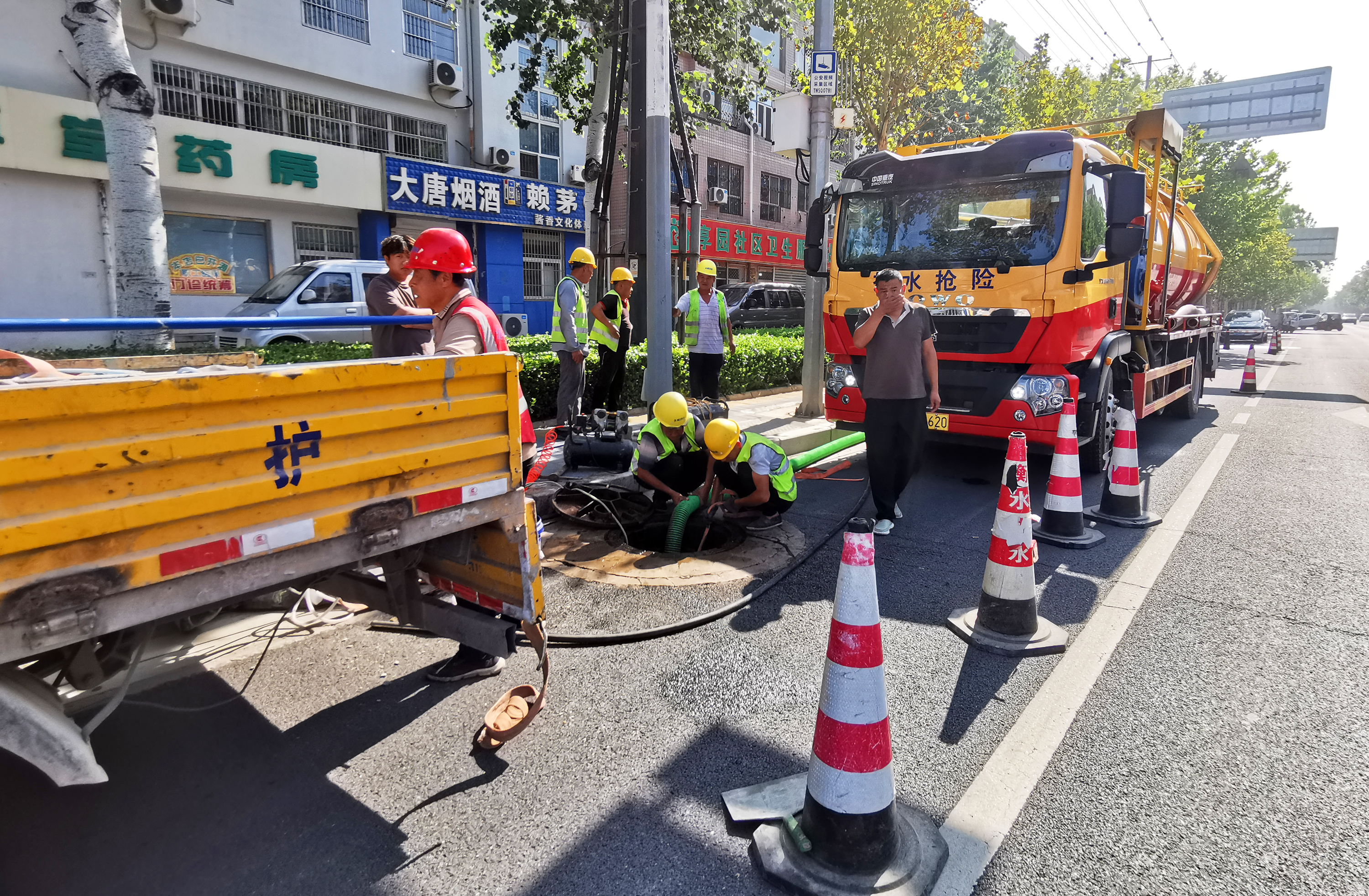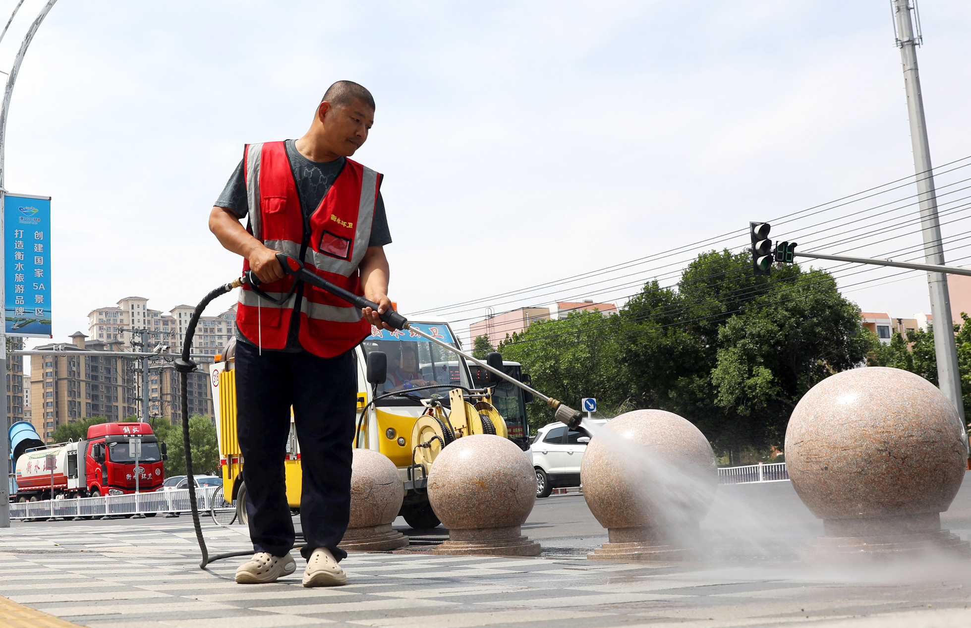 市环卫中心道路清洗作业人员在烈日下坚守工作岗位。
