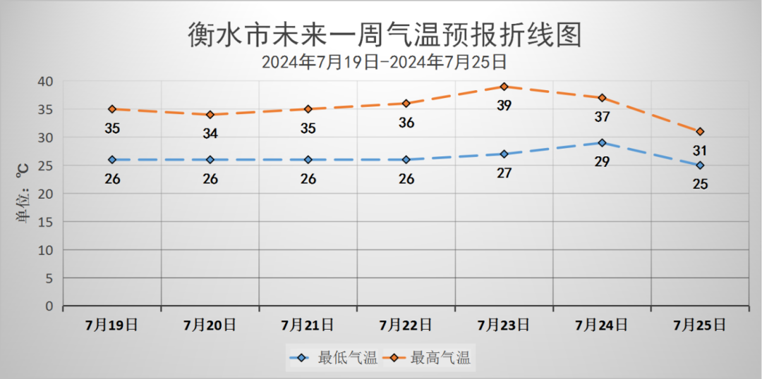 具体天气预报为:7月19日,晴转多云,偏南风3-4级,气温:35到26℃;7月20日,多云转阴,有分散性雷阵雨或阵雨,偏南风3-4级,气温:34到26℃;7月21日,多云转阴,有雷阵雨或阵雨,气温:35到26℃;7月22日,阴有雷阵雨或阵雨转多云,气温:36到26℃;7月23日,多云间晴,气温:39到27℃;7月24日,多云转阴,有雷阵雨或阵雨,气温:37到29℃;7月25日,阴有雷阵雨或阵雨,气温:31到25℃。