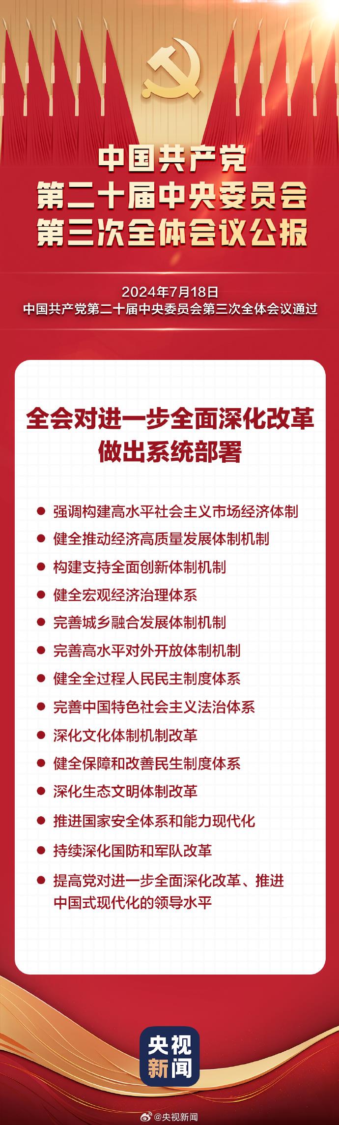 中国共产党第二十届中央委员会第三次全体会议于2024年7月15日至18日在北京举行,全会对进一步全面深化改革做出系统部署,强调构建高水平社会主义市场经济体制,健全推动经济高质量发展体制机制,构建支持全面创新体制机制,健全宏观经济治理体系,完善城乡融合发展体制机制,完善高水平对外开放体制机制,健全全过程人民民主制度体系,完善中国特色社会主义法治体系,深化文化体制机制改革,健全保障和改善民生制度体系,深化生态文明体制改革,推进国家安全体系和能力现代化,持续深化国防和军队改革,提高党对进一步全面深化改革、推进中国式现代化的领导水平。