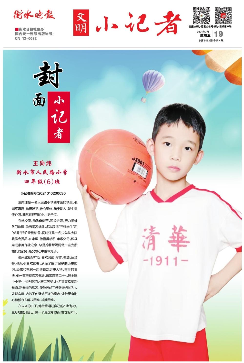 王向炜是一名人民路小学四年级的学生。他诚实谦逊、勤奋好学、关心集体、乐于助人,是个责任心强、非常有担当的小小男子汉。