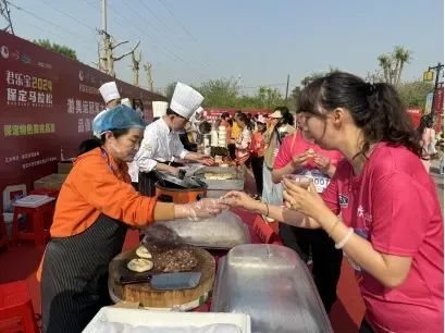 2024保定马拉松补给区,驴肉火烧等味道鲜美、种类丰富的本地特色美食,让来自五湖四海的“跑友”们赞不绝口。刘佳 摄