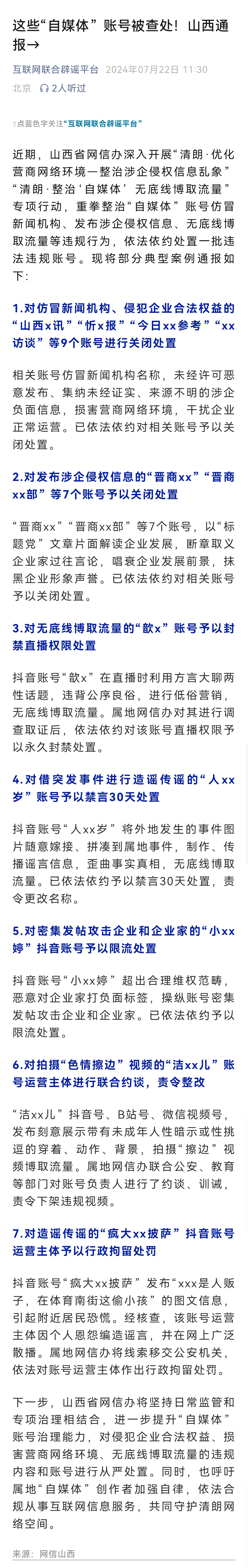 详情:近期,山西省网信办深入开展“清朗·优化营商网络环境—整治涉企侵权信息乱象”“清朗·整治‘自媒体’无底线博取流量”专项行动,重拳整治“自媒体”账号仿冒新闻机构、发布涉企侵权信息、无底线博取流量等违规行为,依法依约处置一批违法违规账号。现将部分典型案例通报如下: