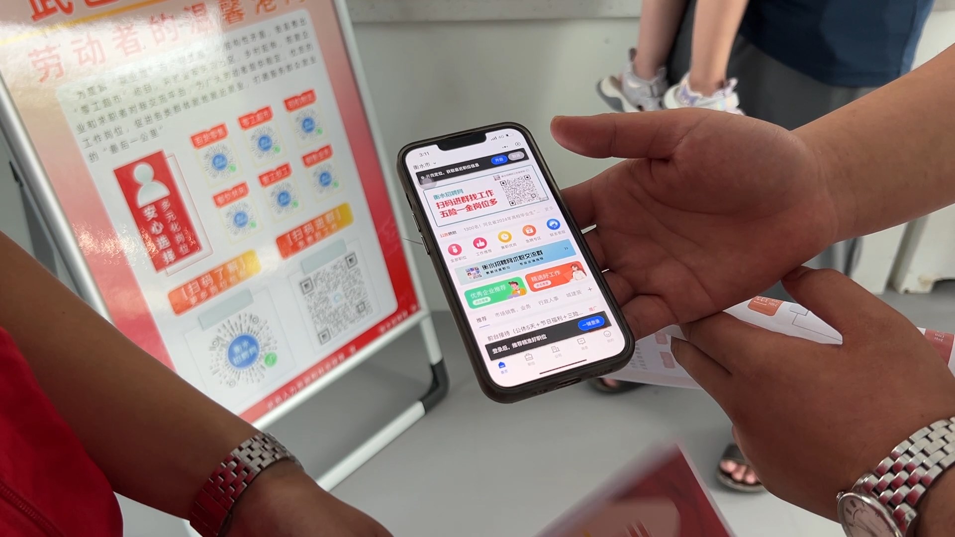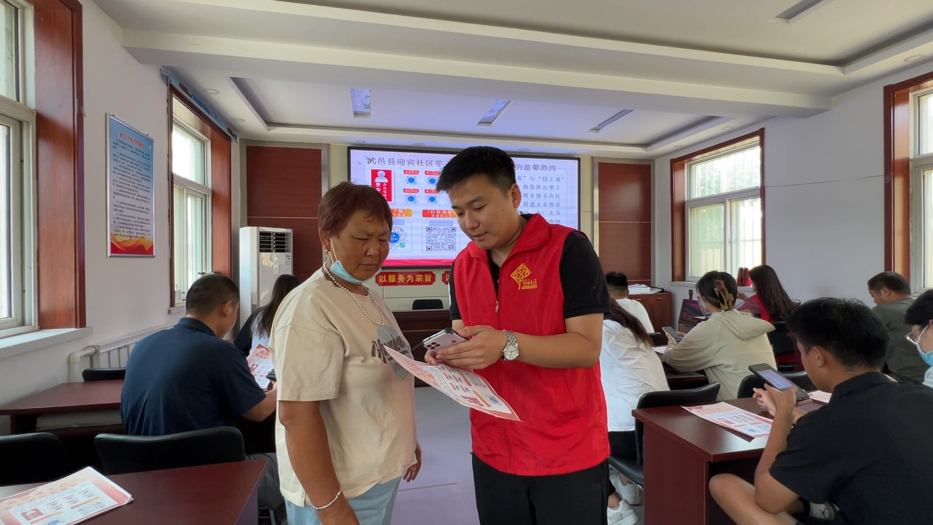 在武邑县迎宾社区“零工超市”服务中心,每天都有前来咨询就业信息的群众。迎宾社区印制了务工信息“明白纸”和宣传单,务工群众可以扫描宣传单上的二维码加入务工群,在群里可以看到各类务工信息,更便捷他们找工作。