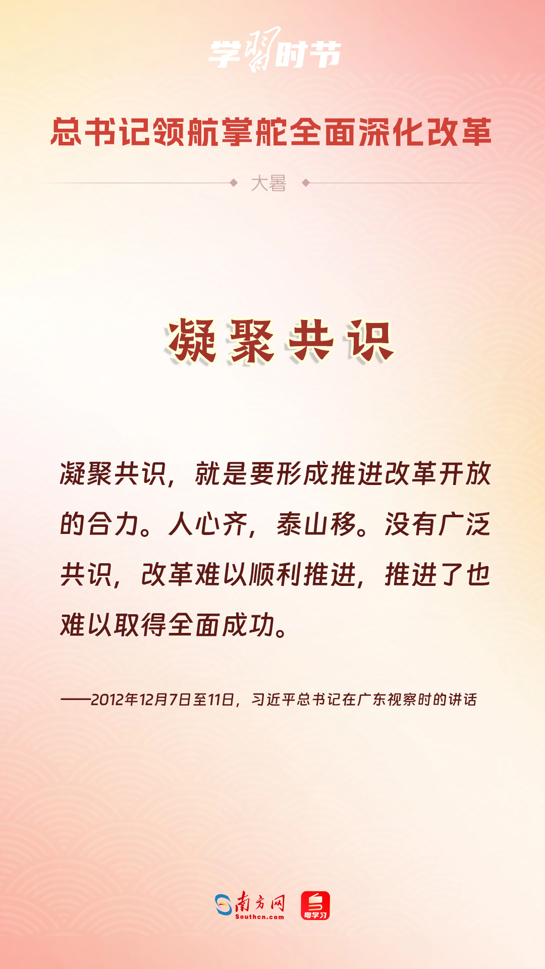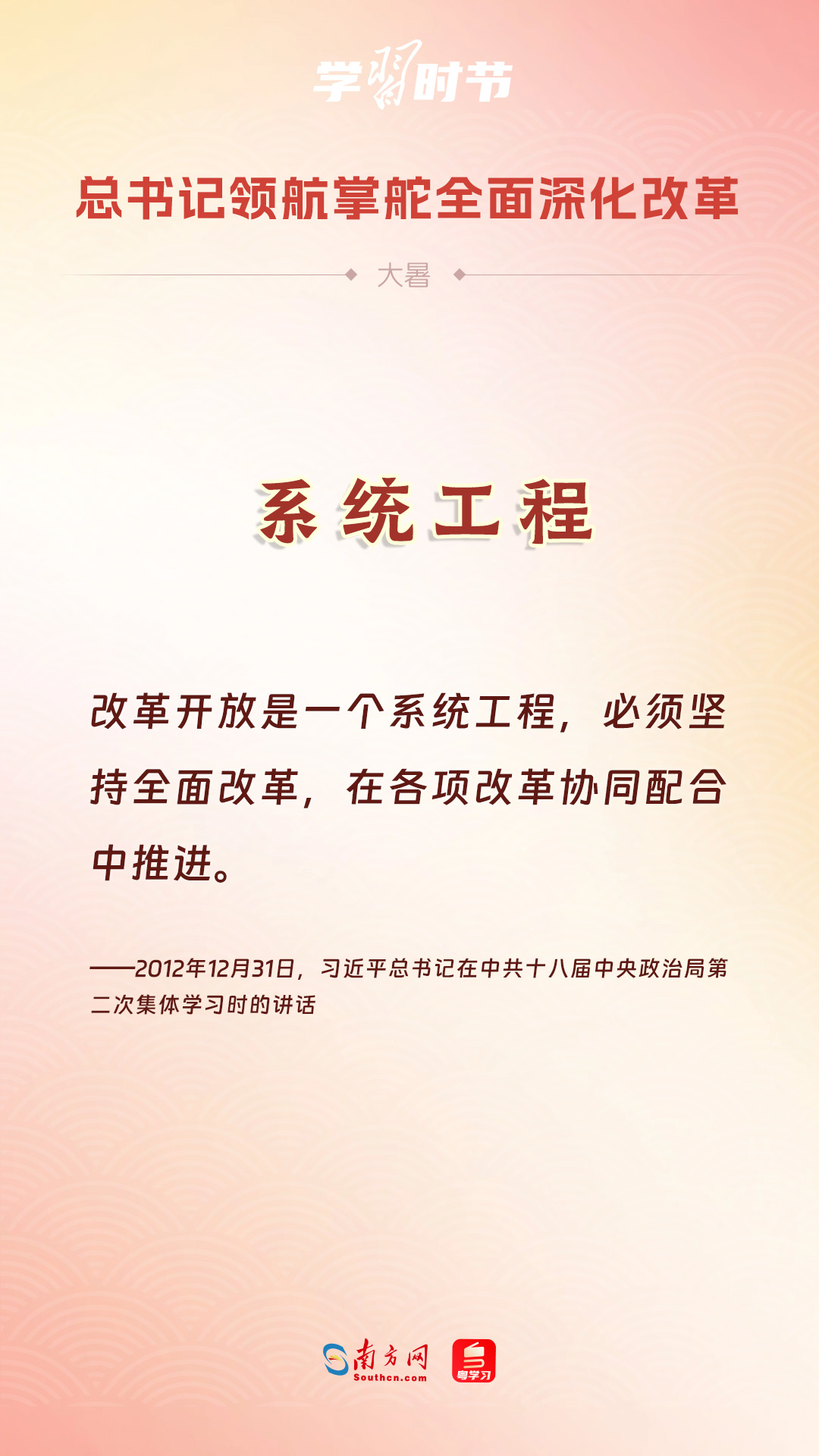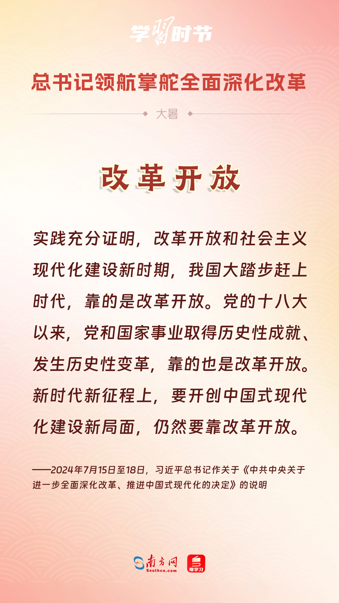 党的十八大以来,习近平总书记亲自领导、亲自部署、亲自推动全面深化改革工作,推动全面深化改革事业在攻坚克难中不断迈上新台阶、取得新胜利。在骄阳似火的大暑时节,通过一组海报,让我们共同学习习近平总书记关于“全面深化改革”的重要论述。