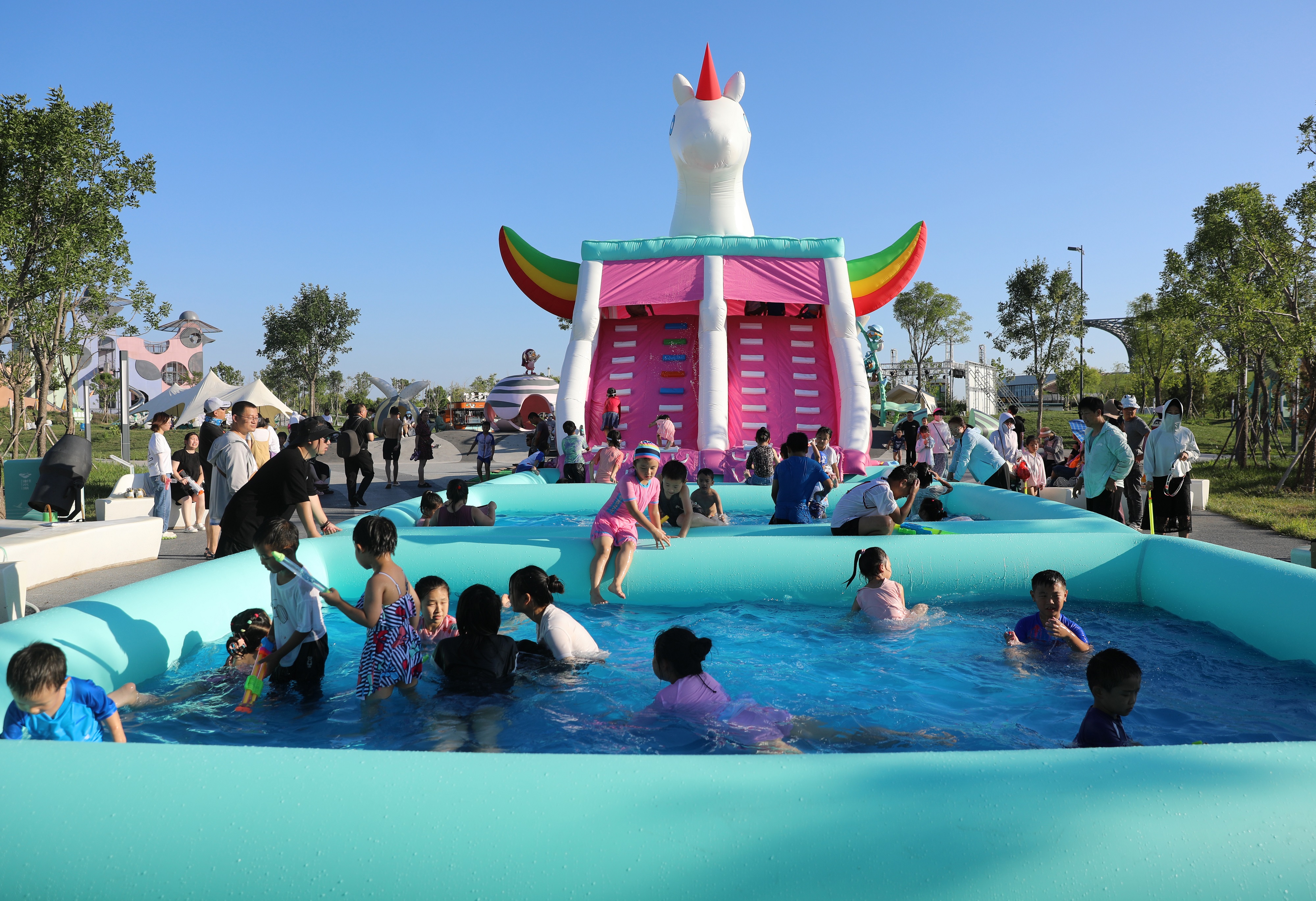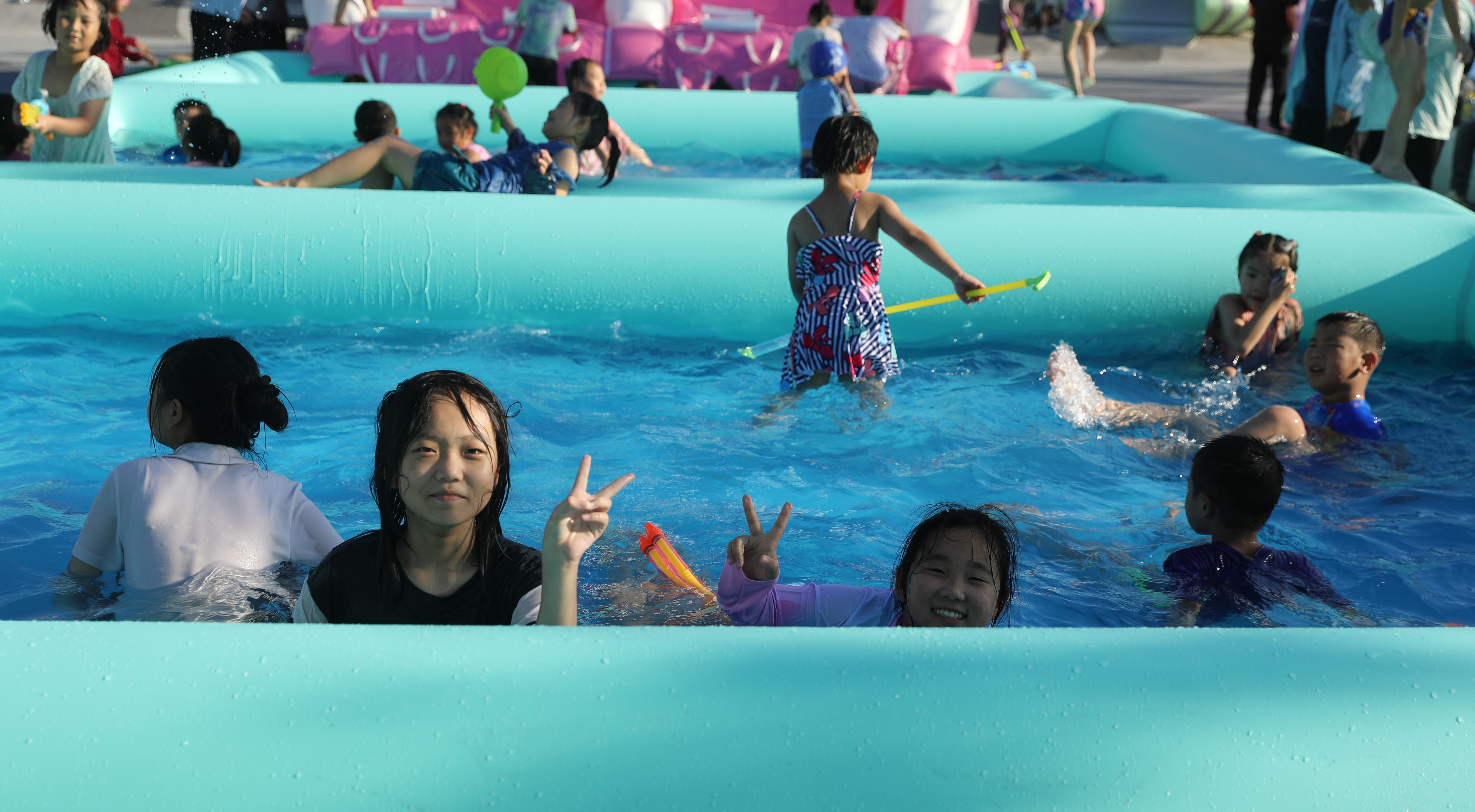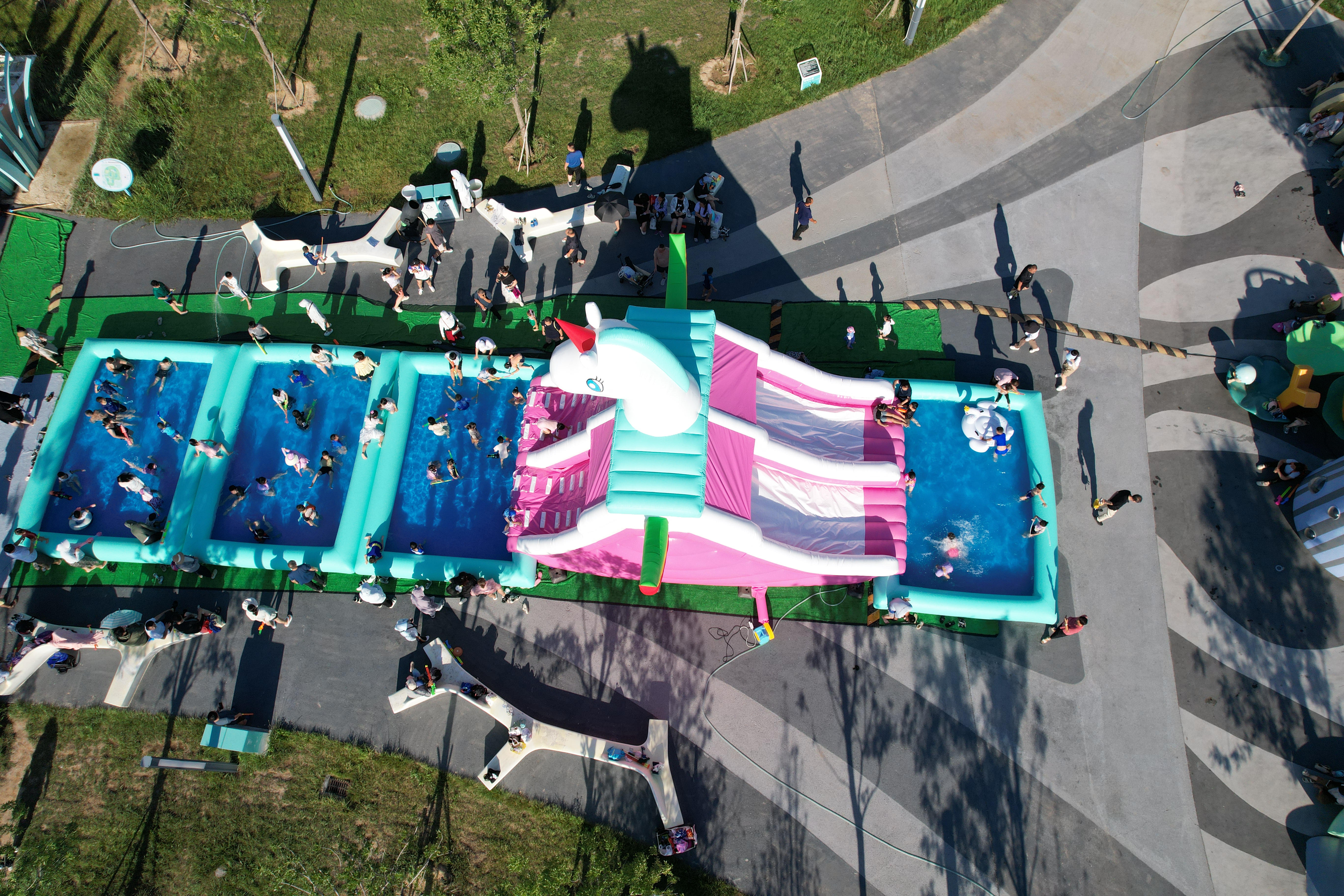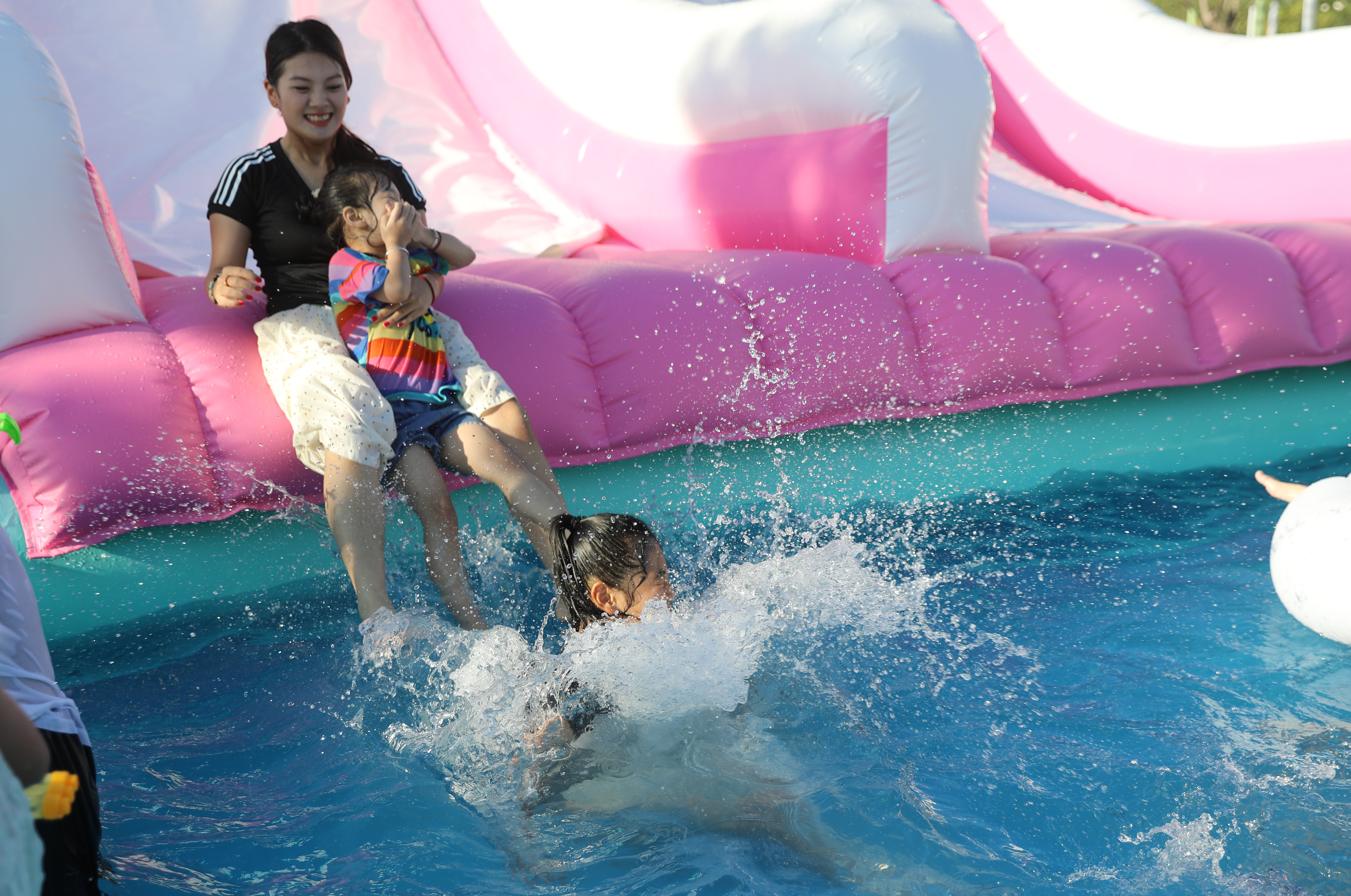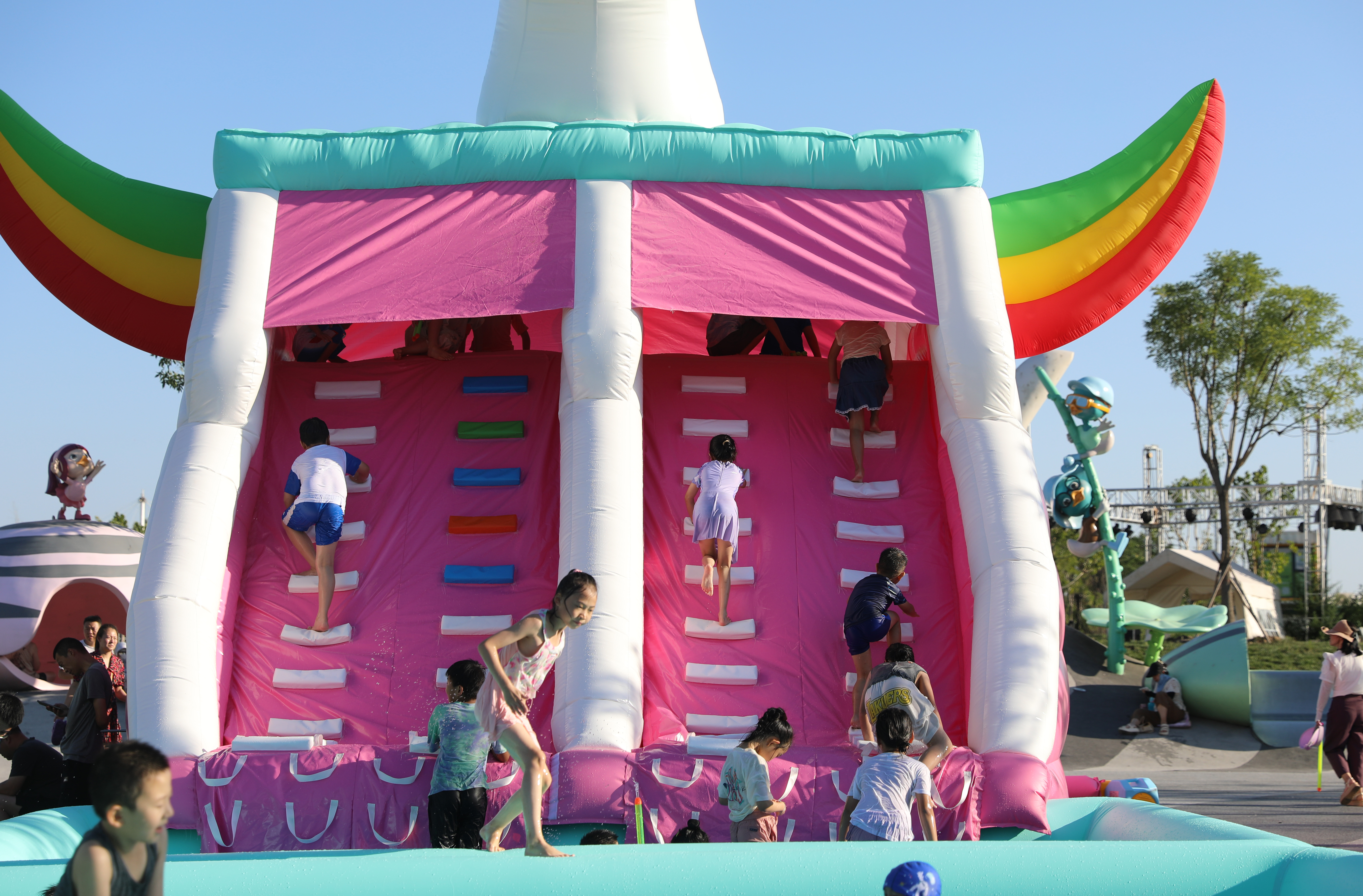 跟随“大魔王”一路行至鸭鸭乐园戏水节入口,一场全新的“亲子剧情沉浸式水战对抗赛”正式开始,在几个大型水上充气城堡里,所有人不管认识与否,就一个字“泼”。只见大家准备了各式各样的“武器”,有的拿水枪,有的拿脸盆,还有人拿着洗车机,就连现场的演员也加入其中,你泼我,我泼你,就算是被泼得满脸水也是用手抹一把继续“战斗”,不管是大朋友还是小朋友,都玩得不亦乐乎。