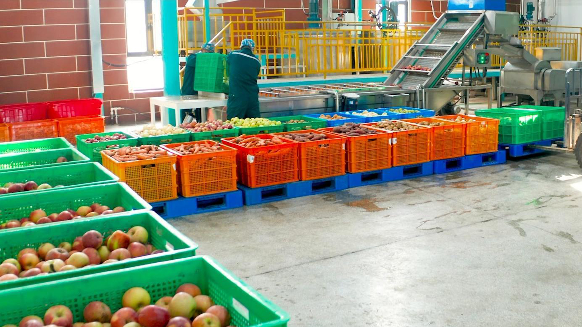 在河北郑庄农牧科技有限公司的备料车间内,整齐地摆放着苹果、胡萝卜等饲料原料,备料人员正在将蔬果投放到进料口打浆,通过过熟化全液态、全封闭管道输送给料系统实现数字化精准投喂。