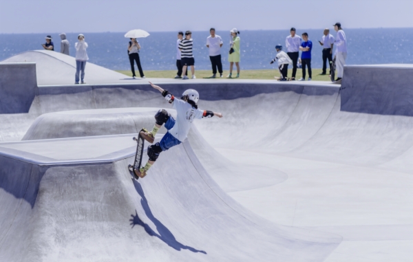 在海边的滑板公园,很多滑板爱好者感受着海风吹拂,尝试着上坡和跳跃。在这个滑板公园内,他们随着滑板腾空而起,又稳稳落地,真的太酷了。而滑板公园只是这个季节来到秦皇岛海边游玩的一个缩影,现在的秦皇岛海边,帆船帆板、海钓冲浪、各种沙滩运动、中国自由式小轮车联赛等赛事和运动接二连三。