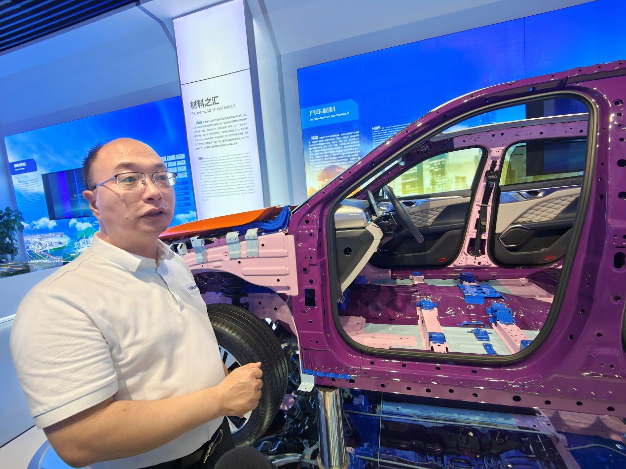 河钢材料院党委书记、院长张彩东介绍,汽车模型的结构件和外覆盖件,不同的颜色代表不同的钢种和不同的级别。强度最高的是紫红色的2000MPa级的热成型钢,是目前在汽车工业应用强度最高的钢材。橘红色的是烘烤硬化钢,它既保障了成型性,又在喷漆涂装过程中,在加热过程中进一步提高钢材的强度,它的抗凹性很强。绿色的是前后的防撞钢梁,车辆发生碰撞时,保障车身的不变型,这是980MPa级的。
