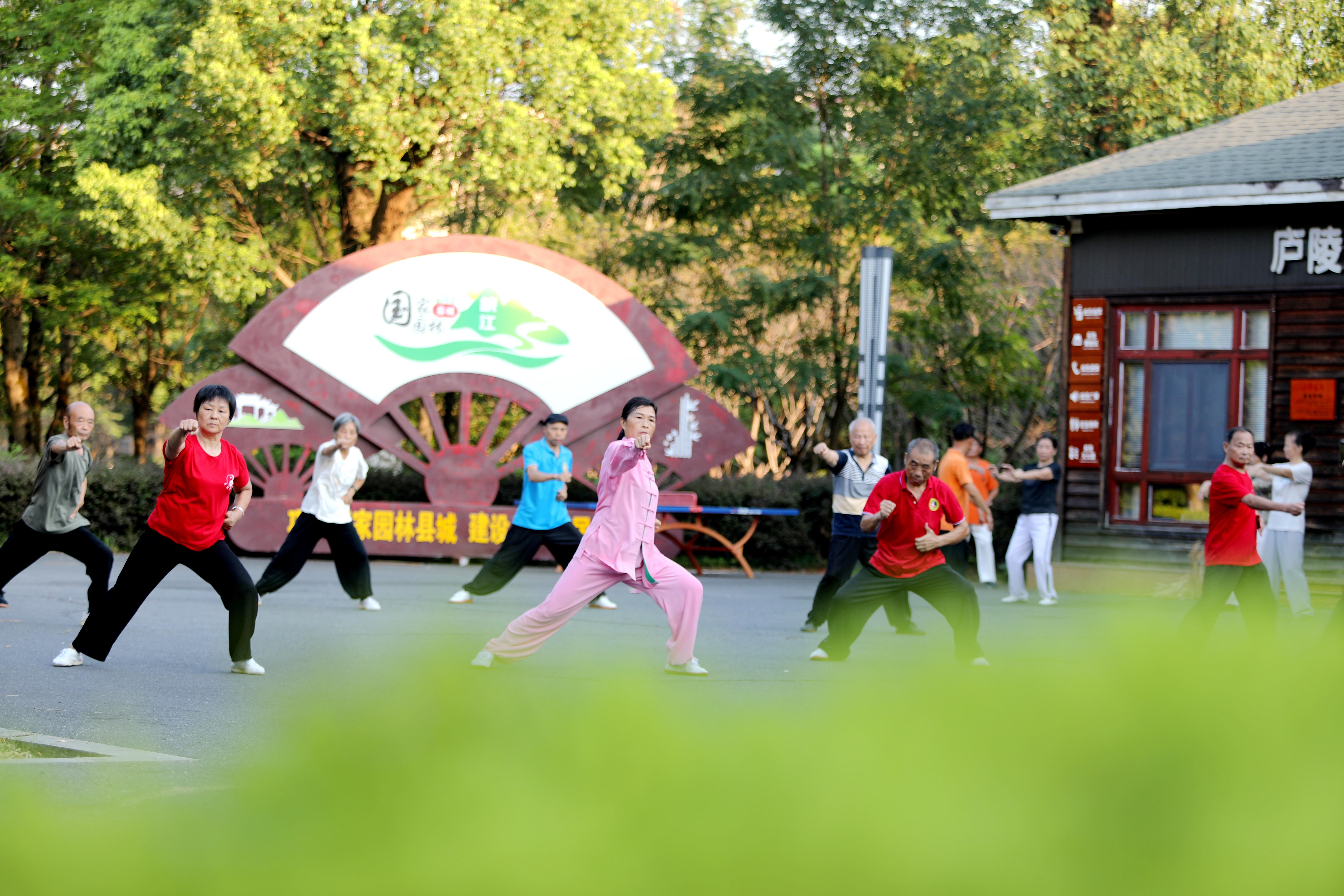 △2024年7月24日,江西省吉安市峡江县水边镇一湿地公园休闲广场,老年人在打太极。