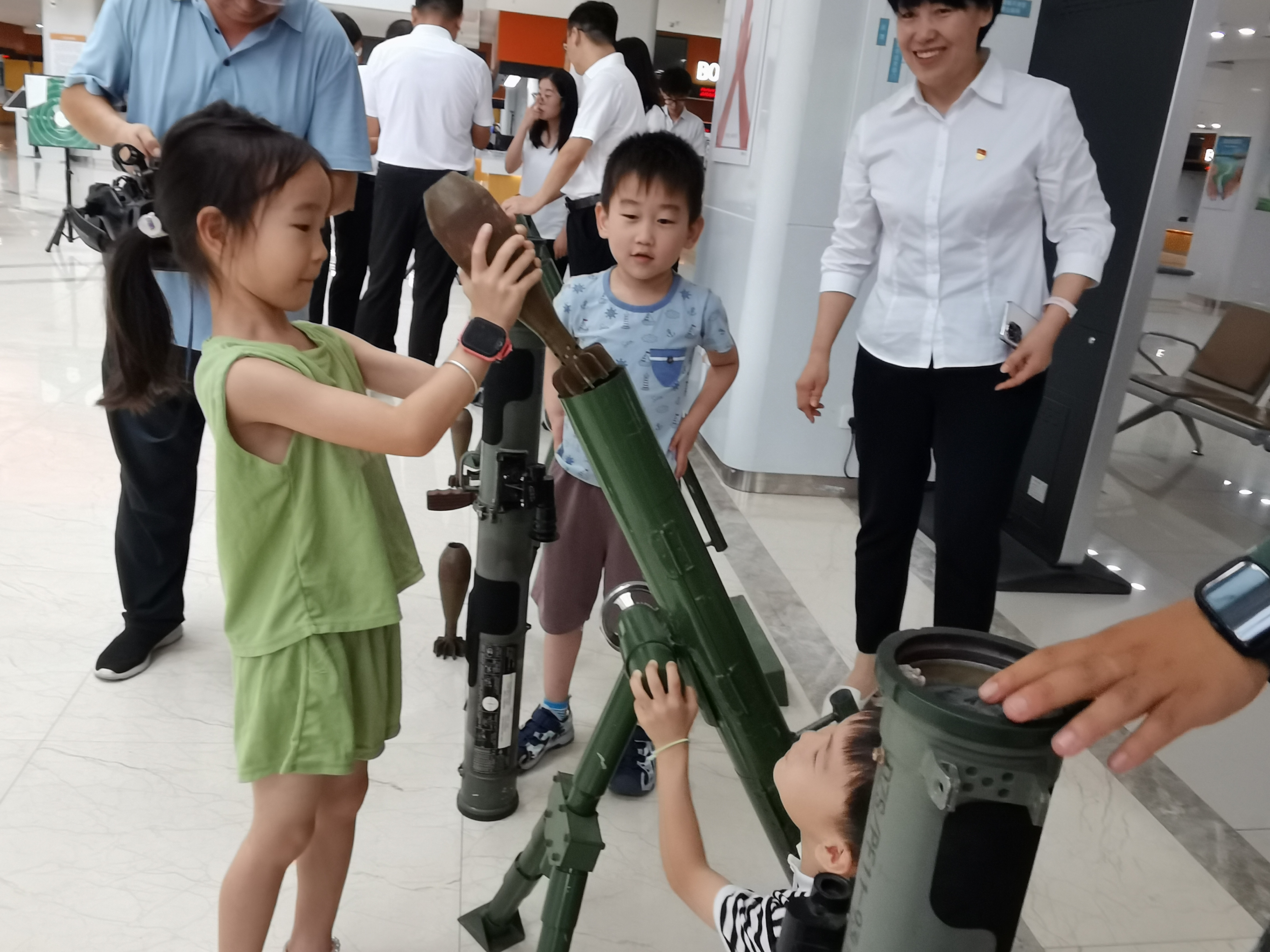 军事技能体验区,还布置有手榴弹、迫击炮、火箭筒、自动步枪武器装备模拟器,供办事群众实际操作体验。