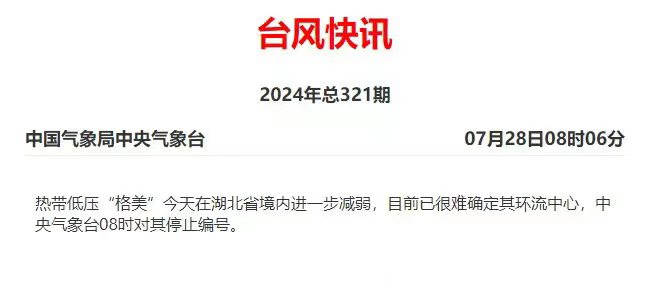 台风“格美”于7月20日14时在菲律宾以东洋面生成,此后其逐渐发展增强为2024年首个超强台风,于7月24日14时左右达到强度峰值(17级,58米/秒)。7月25日0时以强台风级(15级,48米/秒)登陆中国台湾省宜兰县南澳乡沿海,同日19时50分前后在福建省莆田市秀屿区登陆,并减弱为强热带风暴级。7月26日17时前后由福建省移入江西,减弱为热带风暴级,停留24小时后于7月27日17时前后由江西省九江市移入湖北省黄石市境内。目前在湖北省境内进一步减弱,已很难确定其环流中心,中央气象台8时对其停止编号。