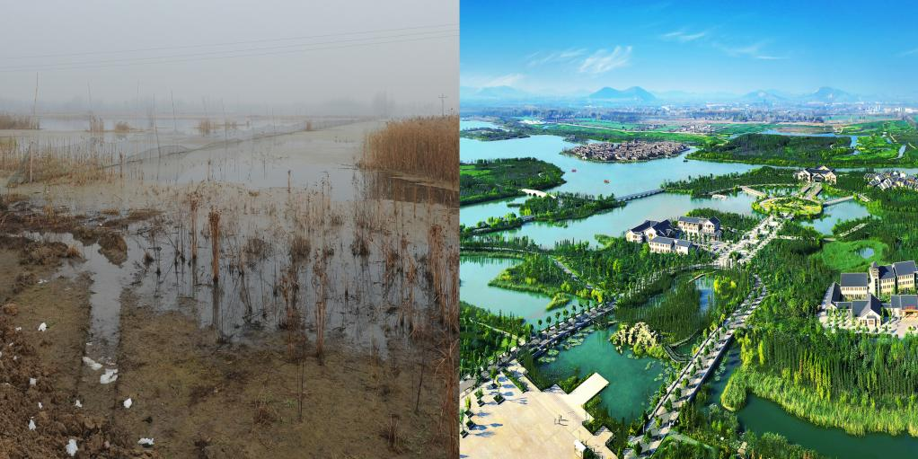 昔日的采煤塌陷区(左)被打造成湿地公园(右)(央广网发 徐州市贾汪区摄影家协会供图)