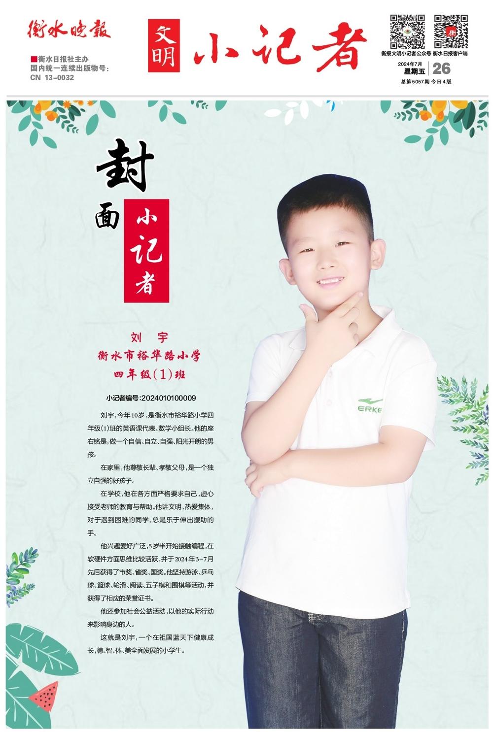 刘宇,今年10岁,是衡水市裕华路小学四年级(1)班的英语课代表、数学小组长。他的座右铭是,做一个自信、自立、自强、阳光开朗的男孩。