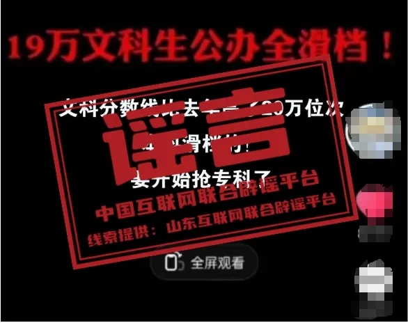 真相:近日,2024年山东高考普通批投档线公布,一则网传“山东19万文科考生滑档”的消息引起网民关注,加重考生及家长的担忧,甚至引发很多人对招生政策合理性的质疑。经山东济南公安部门调查,谣言散布者任某某就职于某教育科技有限公司,该公司主要从事高考志愿导航和复读推介业务。为了博取眼球、招揽生意,任某某在社交平台发布了以上虚假短视频。目前,任某某因虚构事实扰乱公共秩序,被依法处以治安拘留5日的处罚。(来源:山东互联网联合辟谣平台、公安部网安局)