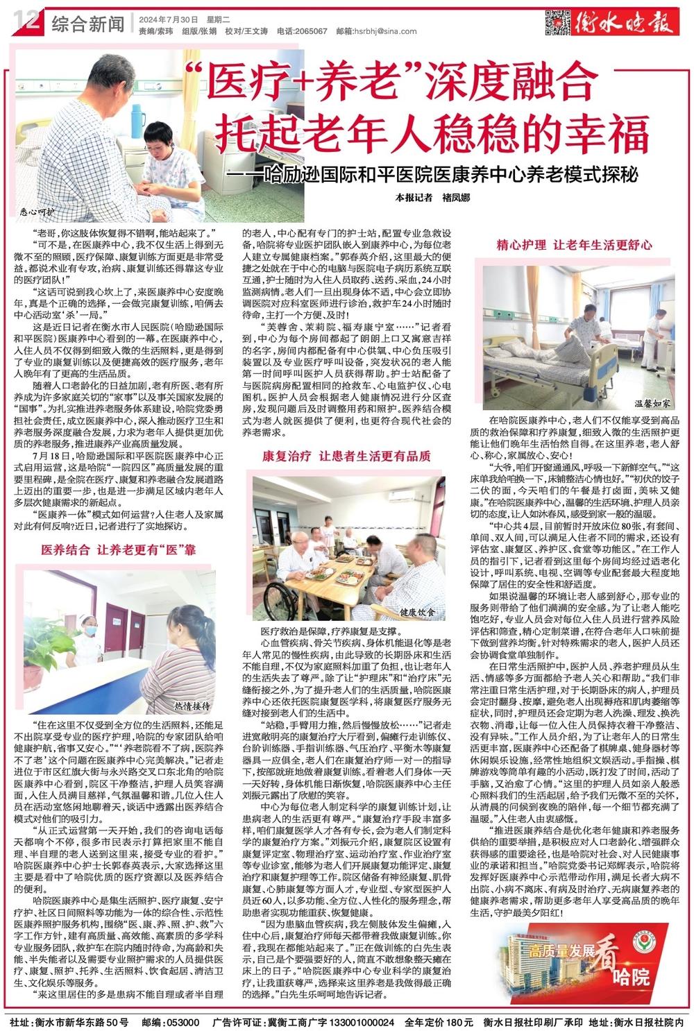 这是近日记者在衡水市人民医院(哈励逊国际和平医院)医康养中心看到的一幕。在医康养中心,入住人员不仅得到细致入微的生活照料,更是得到了专业的康复训练以及便捷高效的医疗服务,老年人晚年有了更高的生活品质。