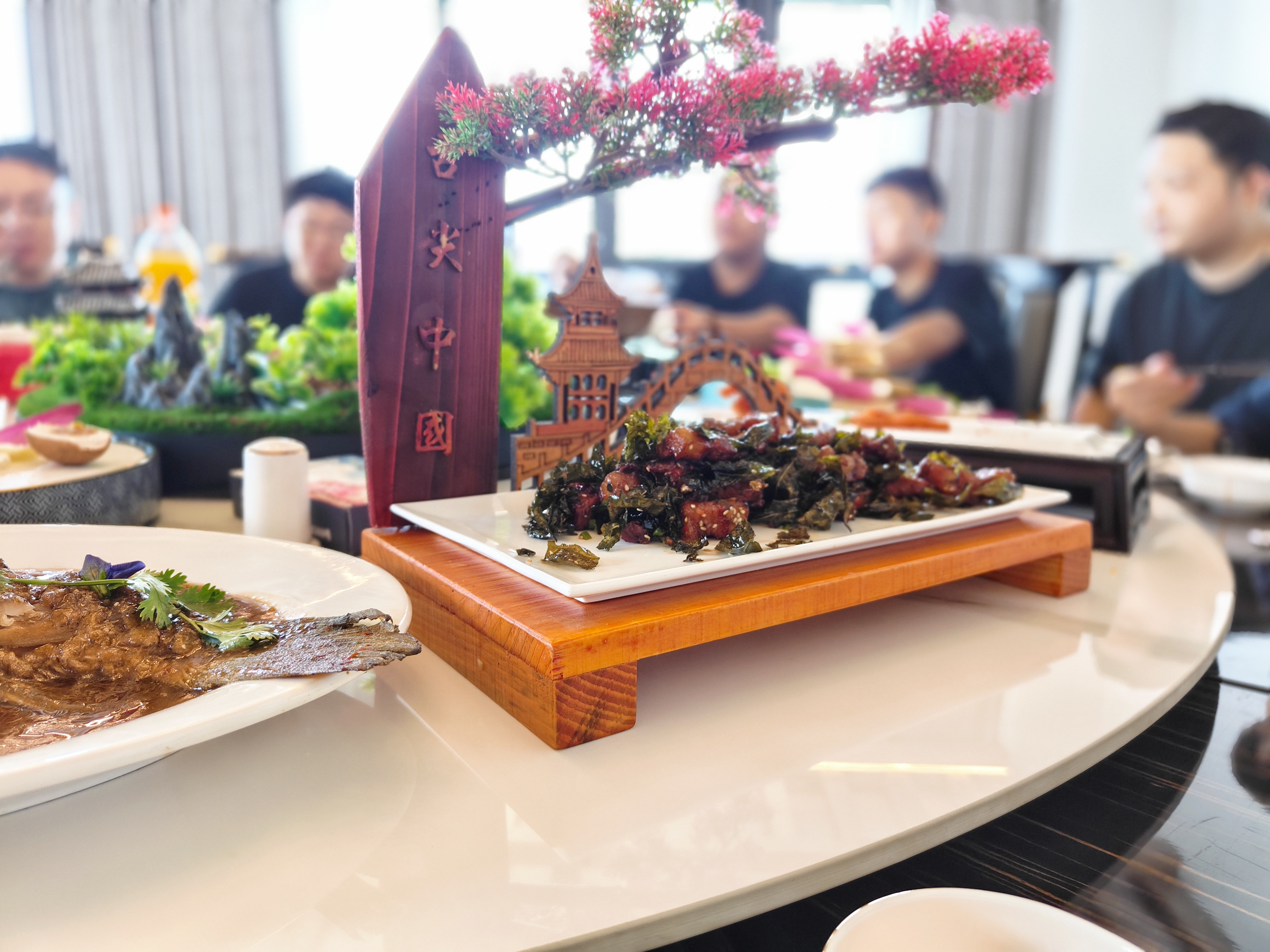 菜品上桌,食客们直呼:“这才是真正的‘色、香、味’俱全!”纷纷拿出手机拍下这些精美菜品,并打趣道“手机先吃”。其中“衡湖晚霞百鸟归巢”这道菜一登场就大受欢迎——“鸟巢”中的荷叶恰似晚霞笼罩着“鸟蛋”,外围“飞鸟”归来,俨然一幅百鸟归巢、阖家欢乐的画面。随后的菜品也颇受好评,“衡湖鸭蛋茴香头”的烤鸭蛋“冒油、不太咸”;“砂锅鱼头煲”鲜香可口;“富贵大虾球”外酥里嫩的虾球配上黄瓜底,入口清脆香甜;“茶香生态黑猪肉”沁入肉里的茶香、恰到火候的烹制让这道菜香而不腻,回味无穷……菜品转眼就一扫而空,食客们纷纷流露出饕餮过后的满足。