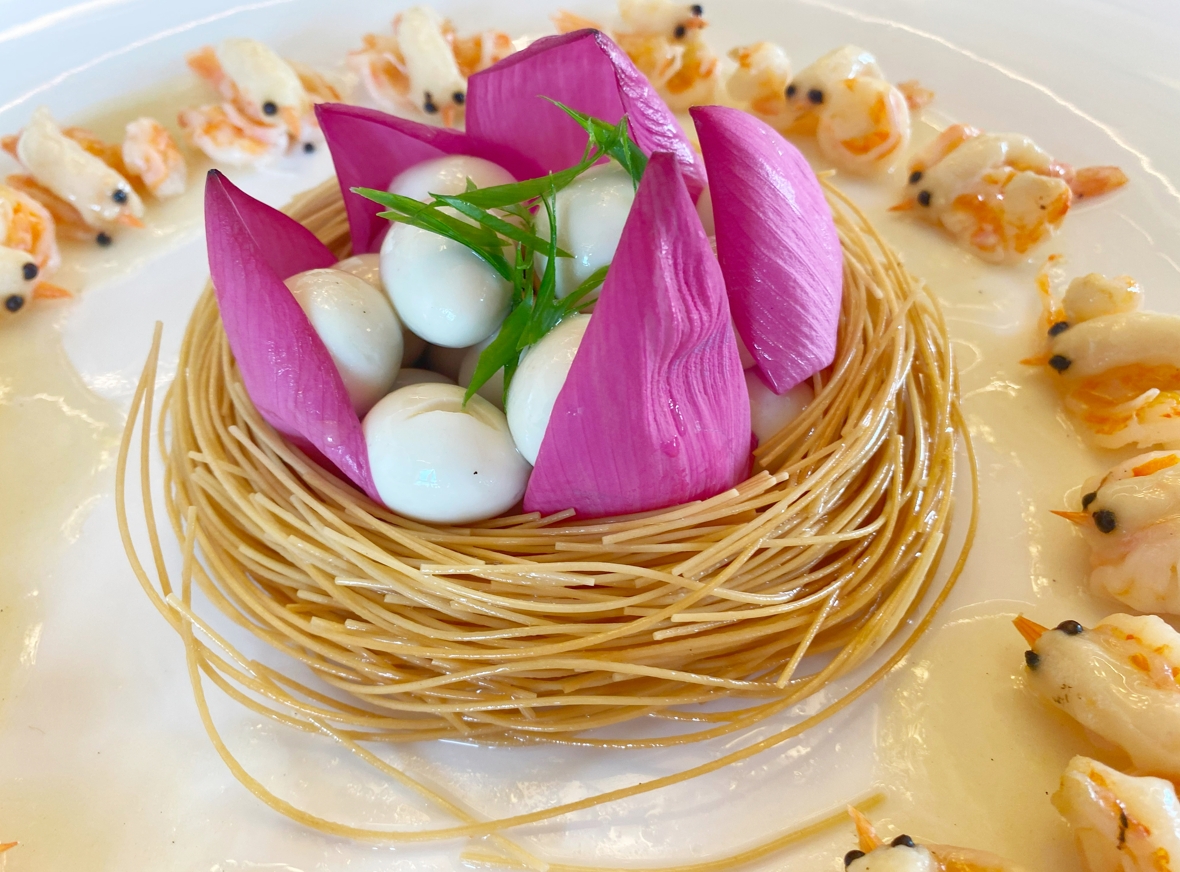 “知味馆菜品都是就地取材,多以鱼、虾、河蟹及水生植物为主要食材,食材安心、味道鲜美、营养价值高。”肖楠说。以“衡湖晚霞百鸟归巢”菜品为例,主要食材为大虾、衡水湖河虾、鲜鸡腿、鹌鹑蛋等,蛋白质和氨基酸丰富,同时富含锌、碘和硒,能够补充营养、增强人体免疫力。