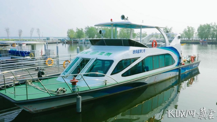 韦芸把我领到了白洋淀码头,这里停靠着一个大家伙——有着雄安监测“小航母”之称的“雄安监测1号”。她跟我说,这相当于一个水上监测实验室,不仅可以对水质快速分析检测,船上还搭载了一艘无人机和两艘无人船,有了它们,狭窄河道也能轻松应对。