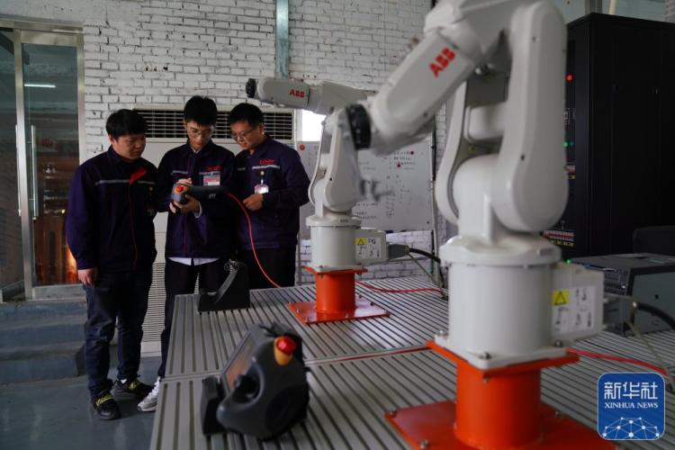 在河北德龙钢铁有限公司自动化实训基地,工作人员在学习机械臂操作。图片来源:新华社